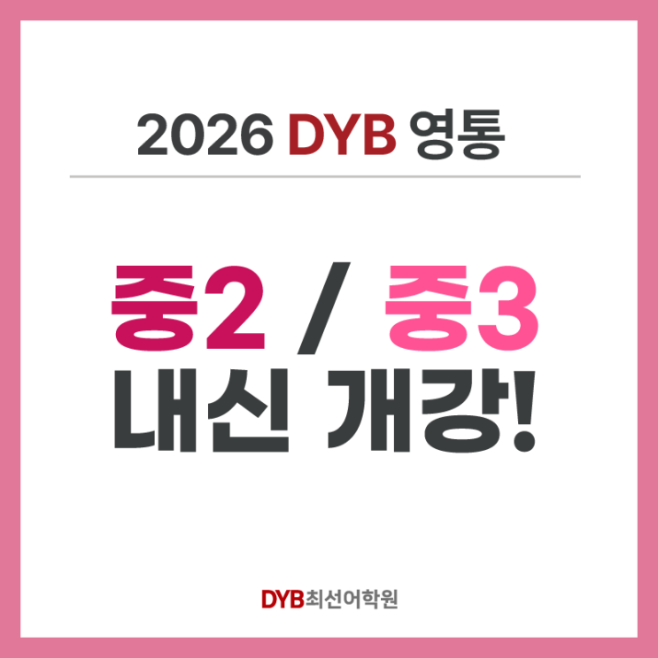 안녕하세요. DYB최선어학원 영통캠퍼스입니다. ✨중2, 중3 1학기 중간고사 내신 개강✨ 안내드립니다. 중2 1학기 일정 4/1(수), 2(목), 3(금) 시작 ✔️학교별 집중 공략 ✔️1:1 밀착 담임 관리 ✔️백점 맛집 ✔️외부 지문 완전 정복 ✔️DYB 단독 내신 교재 중3 1학기 일정 ✔️중간고시 대비 : 3/30(월) ~ 4/28(화) ✔️정규 시작 : 4/29(수) (**변동 시 안내**) 중3부터 180도 달라지는 영어 난이도 고등 대비형 중간고사 특강으로 확실히 대비하기! ✔️ Step 1. 공통 문법 다지기 (1-2주차 진행) ✔️ Step 2. 블렌디드 러닝 (1-4주차 진행) ✔️ Step 3. 학교프린트 및 기출문제 (3-4주차 진행) ✔️ Step 4. Final Sim....... <img src="https://blogthumb.pstatic.net/MjAyNjAzMzBfNDUg/MDAxNzc0ODMzNjQ4NDQ1.Rvo9KS1AFpGYf7_asDemDNTfTEw8IKTpvVmEEGJEzHYg.IUFY8fqw5v_xJMzcHZNl60JKC2UHc5fE3rV3Of1_VcIg.PNG/%B4%EB%C1%F6_8.png?type=s3" />