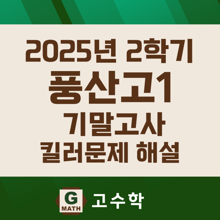 안녕하세요, 고수학&허그수학입니다. 2025학년도 2학기 풍산고 1학년 수학 기말고사는 단순한 계산 숙련도를 묻기보다, 함수의 의미를 얼마나 정확히 이해하고 있는지를 평가하는 시험이었습니다. 특히 -함수의 정의 -그래프 해석 -역함수와 절댓값 함수의 결합 과 같은 고1 핵심 개념을 조건 해석형 문항으로 출제하여, 문제를 “읽는 힘”이 성적을 크게 좌우한 시험이었습니다. 풍산고 1 기말고사 17번 문제 1️⃣ 핵심 변별 문항: 조건이 많은 함수 문제 이번 시험에서 학생들이 가장 어려워했던 문항은 유리함수 f(x)에 여러 조건이 동시에 주어진 문제였습니다. 대표적으로,|f(x)|의 그래프가 직선과 한 점에서만 만난다는 조건 f....... <img src="https://blogthumb.pstatic.net/MjAyNTEyMjZfMTQg/MDAxNzY2NzE0OTM5NzU5.0lVW5uKoSXLFARE2B94NRvrwtXb9sivcFgvHJPMzdkYg.pAAlIbBWUX2lqw-mGeRr0YIS0rALeV1ELnj0-QhJgrMg.PNG/%C1%A6%B8%F1%C0%BB_%C0%D4%B7%C2%C7%D8%C1%D6%BC%BC%BF%E4._%281%29.png?type=s3" />