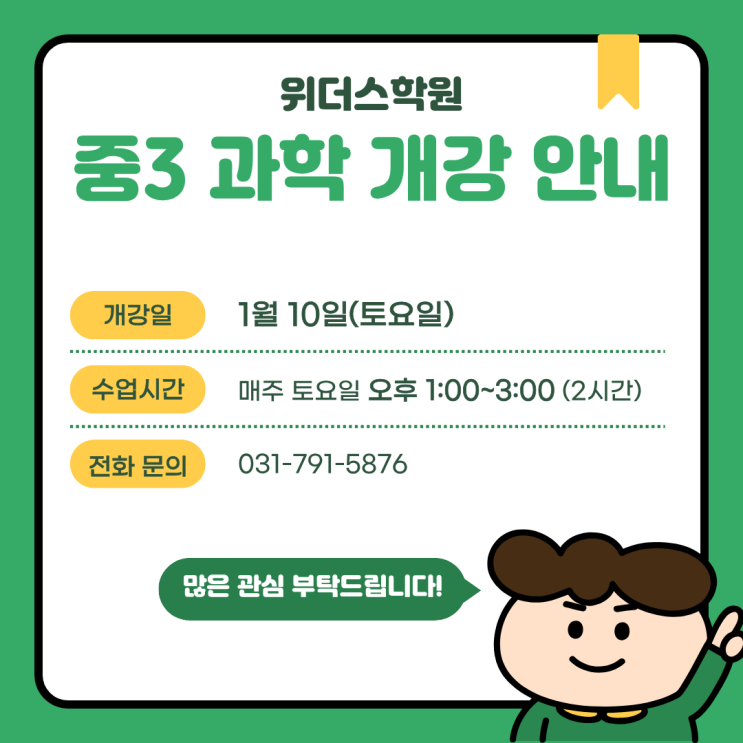 안녕하세요, 위더스학원입니다. 1/10(토) 중학교 3학년 학생들을 위한 과학 수업이 새롭게 시작됩니다. 탄탄한 기초 확립은 물론 고득점을 위한 심화 과정까지 한 번에 대비 가능한 커리큘럼으로 준비했습니다. 많은 관심 부탁드립니다. 감사합니다. <img src="https://blogthumb.pstatic.net/MjAyNjAxMDRfMTcy/MDAxNzY3NTA4MTAxMDk2.WbRbnR-GbGMX94QoUYIXZv0FYfibWpK6Kzkm2GI019og.0fQAegZJhZFDDSP3vhGMh9O2hKIMmBxuH6C0lh-NLs4g.PNG/%C1%DF3%B0%FA%C7%D0%BE%C8%B3%BB.png?type=s3" />