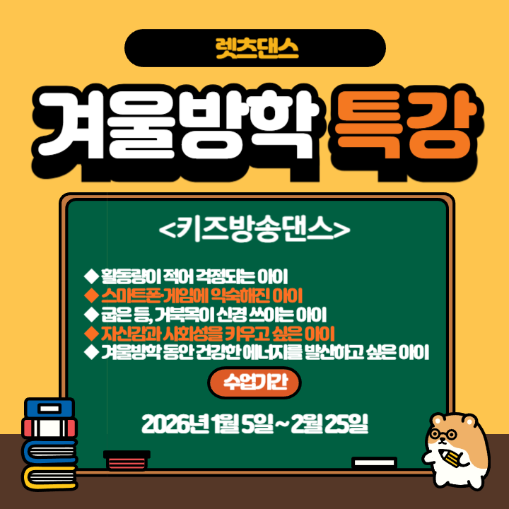 렛츠댄스 겨울방학 키즈방송댄스 특강 모집 중 겨울방학이 다가오면 많은 부모님들이 고민하십니다. "아이를 집에만 두기엔 활동량이 너무 부족한데..." "학원은 많은데 아이가 즐겁게 다닐 수 있을까?" 렛츠댄스는 이런 고민에서 출발했습니다. 아이들이 억지로 하는 수업이 아닌 스스로 기다려지는 시간! 그리고 자연스럽게 몸과 마음이 함께 성장하는 수업을 만들고자 합니다. 이번 겨울방학, 렛츠댄스에서는 키즈방송댄스 겨울방학 특강을 진행합니다. 요즘 아이들이 가장 좋아하는 K-POP 방송댄스를 중심으로 리듬감, 표현력, 체력을 동시에 키워주는 알찬 프로그램입니다. 키즈방송댄스, 왜 좋을까요? 방송댄스는 단순....... <img src="https://blogthumb.pstatic.net/MjAyNTEyMjhfMTg1/MDAxNzY2ODk1ODg2NjEx.puPD7TuLdxhrGeC_AnEokfQDPuwzZYomNt9ncy1H1jkg.JuZNYA2s-jNeuoyb8o5j9_0M99HqyEXrIK_GeueMid8g.PNG/%C1%A6%B8%F1%C0%BB_%C0%D4%B7%C2%C7%D8%C1%D6%BC%BC%BF%E4_-001_-_2025-12-28T132435.795.png?type=s3" />