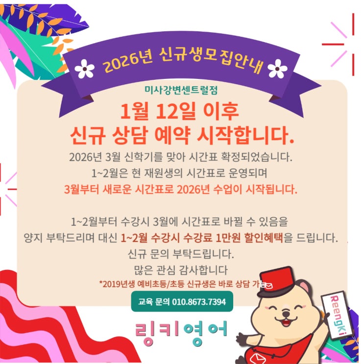 안녕하세요? 링키영어 미사센트럴프라자 원장 레이나입니다. 2026년 새해가 밝았습니다~ 모두 새해 복 많이 받으세요! 현재 내년도 신규 문의가 많아 공지드립니다. 3월부터 신규생 수업이 시작되오나 1~2월에 링키를 시작하시는 경우 현 링키의 예비초등들이 아직 유치원 등원 관례로 현재는 2025년 시간표로 운영되어 2026년 3월부터 바뀔 수 있음을 양지하시어 수강해주셔야합니다. 이러한 불편이 있을 수 있어 수강료 할인 혜택을 드리려고 합니다. 1~2월 수강시 1만원 수강료 할인 혜택을 드립니다. 1월 12일부터 신규생 수강 예약 상담이 시작되오니 참고 하시어 문의 부탁드립니다. 각 반 8명 소수정예 수업으로 진행됩니다. 5세반(2022년....... <img src="https://blogthumb.pstatic.net/MjAyNjAxMDVfMjk1/MDAxNzY3NjA2MDc5MTk2.lkbREO6tWiWO7-yKC9AADzOE-oRA-J5t7dsDbM3Enucg.2Y4B8dTl9nnZV_KLtZHNk4g5dMDaLglnspiAChrn4IAg.JPEG/%C1%A6%B8%F1%C0%BB_%C0%D4%B7%C2%C7%D8%C1%D6%BC%BC%BF%E4_-001_%281%29.jpg?type=s3" />