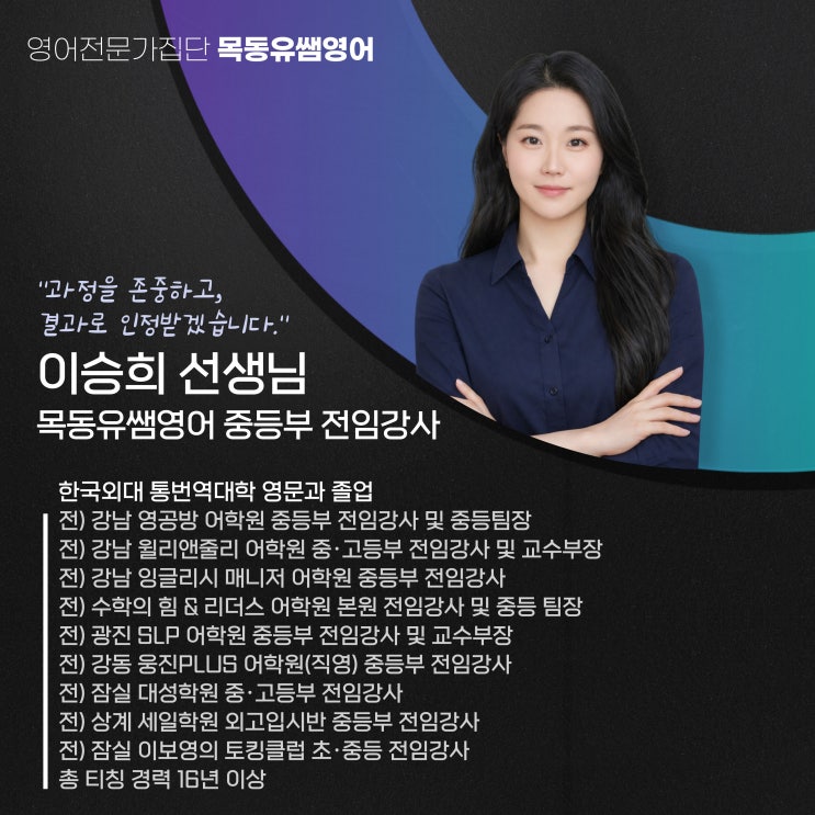 이승희 선생님은? ✔️ 주요 경력 목동유쌤영어 중등부 전임강사 전) 강남 영공방 어학원 중등부 전임강사 및 중등팀장 - 대왕중, 중동중 담당 전) 강남 윌리앤줄리 어학원 중·고등부 전임강사 및 교수부장 - 대왕중, 대청중, 중동중, 일원중, 세종고 담당 전) 강남 잉글리시 매니저 어학원 중등부 전임강사 - 대명중, 언주중 담당 전) 수학의 힘 & 리더스 어학원 본원 전임강사 및 중등 팀장 전) 광진 SLP 어학원 중등부 전임강사 및 교수부장 전) 강동 웅진PLUS 어학원(직영) 중등부 전임강사 전) 잠실 대성학원 중·고등부 전임강사 전) 상계 세일학원 외고입시반 중등부 전임강사 전) 잠실 이보영의 토킹클럽 초·중등 전임강사 외고 입시....... <img src="https://blogthumb.pstatic.net/MjAyNjAxMjJfMTkx/MDAxNzY5MDcwNzkyNzUw.wwzSsWyeahUh8ij36K4-55QrjB0ykkWDwRxmMNn-s5Yg.BX5Jb2uWUnjnpPYZc7unbKtWTiZ8XIkYBvT-Hk-9ObUg.JPEG/%B0%AD%BB%E7%C7%C1%B7%CE%C7%CA_26%B3%E21%BF%F9_%C0%CC%BD%C2%C8%F1_%BC%B1%BB%FD%B4%D4_02.jpg?type=s3" />