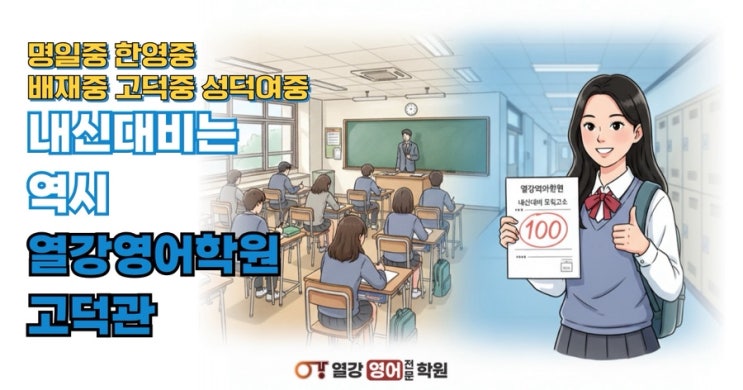 명일중 한영중 배재중 고덕중 성덕여중 영어 내신 대비, 왜 열강영어여야 할까요? 중등 영어 내신을 단순히 생각하면 앞으로 치를 여러 시험 중 하나, 어차피 어렵지도 않은데 어느정도만 준비하면 되지 않을까? 하는 생각이 들 수 있습니다. 하지만, 대치동 고등 내신 최상위권 학생들이 중등시절 내신대비 학원을 다니는 이유는 내용이 어려워서가 아닙니다. 고등학교에 가기 전에 문제를 빠르고 정확하게 푸는 연습, 의미 단위로 끊고 분석하는 연습, 내신 대비를 위한 기초체력을 닦는 것이죠. 열강영어는 중등 내신을 단기 점수용 수업이 아니라 고등 영어로 이어지는 출발선으로 봅니다. 그래서 수업의 기준이 다릅니다. 열강영....... <img src="https://blogthumb.pstatic.net/MjAyNjAyMTNfMjA3/MDAxNzcwOTY5MzMxODAw.AXR5jR-1qUosjtvD4mbUF3huFWXc5DN62rLLyVbfHzUg.aeF2V1x99jI3fIR1cyNGw-l9rz20xmqEZ6hlqX1kGuUg.JPEG/IMG%A3%DF3832.JPG?type=s3" />