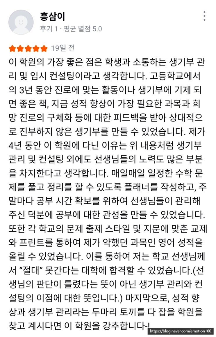 생전안하던 "당근"에 학원 광고를 게시하던 날. "당근"에 광고를 하는 것이 속된말로 없어보여서.... 광고 따위는 하지 않으려 했는데.. 10년간 특별히 광고를 하지 않았으니 이제는 조금 달라지자 싶어 용기를 냈지만, 실장님께 부탁드려 가장 대중적인 당근에 광고글을 올리면서도 마음은 편치 않았다. 시간이 지나, 당근에 게시되었던 학원 광고에 달린 5개의 후기를 보게 되었는데, 학원 출신 제자들이 남긴 후기였다. "감동의 도가니탕" 이라는 말은 이럴 때 쓰는거구나. 이 후기는 유찬이가 작성했다고 들었는데, 자식, 군 생활 잘하고 있냐. 너무 순하고 착해서 무조건 참지만 말고 할 말은 하고 살아야 한....... <img src="https://blogthumb.pstatic.net/MjAyNjAzMDRfNTMg/MDAxNzcyNjIyNDYzNzE3.soMk5G8klj8JKOD2yNuXJWcFNah1IEoRDCEuHTHQ8eIg.IHq3KFpbb3T9Ys7wRrP6wrqjPTn9IsyxoL9YreZTLwAg.JPEG/900%A3%DFScreenshot%A3%DF20260304%A3%DF193249%A3%DFKarrot.jpg?type=s3" />