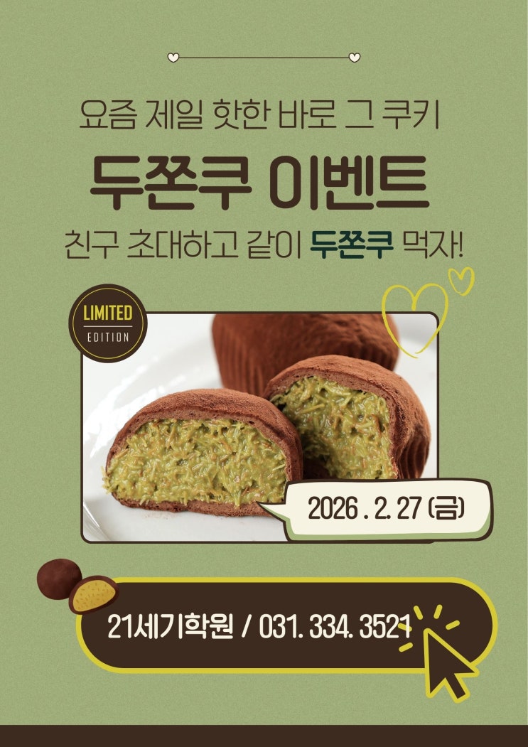둔전초, 둔전제일초, 포곡초 성산초, 고진초 학원: 용인 초등전문학원 2026. 2월 행사 / 두쫀쿠 이벤트 친구랑 같이 먹으면 더 맛있다! 21세기학원 두쫀쿠 초대 이벤트 안녕하세요 용인 포곡·둔전 21세기학원입니다. 요즘 제일 핫한 그 쿠키! 쫀득한 식감에 진~한 필링이 가득한 두쫀쿠를 우리 아이들과 함께 나누려고 준비했습니다. 그런데 이번엔 조금 특별합니다. 친구 초대하면, 친구도 같이 먹을 수 있어요! ✔ 우리 학원 친구 → 두쫀쿠 제공 ✔ 초대받은 친구 → 함께 두쫀쿠 제공 “나만 먹는 이벤트”가 아니라 친구와 함께 먹는 이벤트입니다 ✨ 새 학기 시작 전, 좋은 친구와 좋은 공부 습관을 함께 시작할 수....... <img src="https://blogthumb.pstatic.net/MjAyNjAyMjJfMTQ2/MDAxNzcxNzM5NzIxNzM4.hrL32Q0JOCzNEf-LGB6koB7A11b0whGJiRU5U20wQ3Qg.ChNJ34YPbfTlypiCdXkOc5PL0-2AJI_VufcxbyUTIMEg.JPEG/%C3%CA%B7%CF%BB%F6_%B0%A5%BB%F6_%B1%F2%B2%FB%C7%D1_%B9%DF%B7%BB%C5%B8%C0%CE%B5%A5%C0%CC_%B5%CE%B9%D9%C0%CC_%C2%CB%B5%E6_%C4%ED%C5%B0_%C6%F7%BD%BA%C5%CD.jpg?type=s3" />