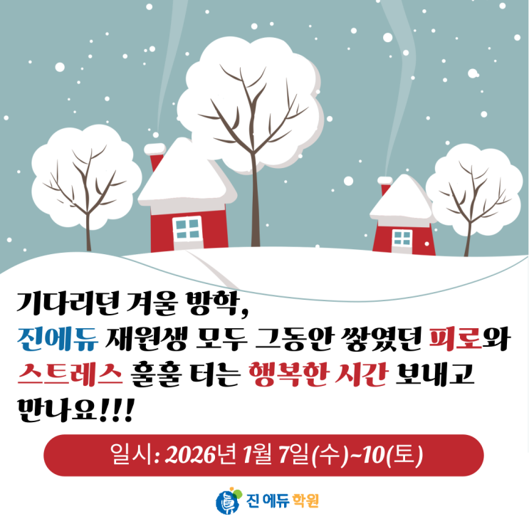 2026년 새해가 밝았습니다. 지난 한해 진에듀에 보내주신 믿음과 애정에 진심으로 감사드립니다!! 2026년에도 변치 않는 초심으로, 아이들에 대한 최선의 지도와 노력을 다하겠습니다!!!! 새해 복 많이 받으세요!!! 다음은 진에듀 방학 일정입니다. 그동안 들뜬 분위기는 가라앉히고, 새학기를 제대로 준비할 수 있는 겨울이 되도록 하겠습니다. 완충하고 다시 만나요!!!^^ #고림고 #고림중 #고진중 #진덕고 #고림동내신 #고림동학원 #진덕지구학원 #고림국어 #고림수학 #고림영어 <img src="https://blogthumb.pstatic.net/MjAyNjAxMDZfMjQg/MDAxNzY3NjgxODQ1MDY3.kK_I__ZZQ5p9vpL8x2R-muAhNoPKp93wCazJCeviKeMg.tCmXQ2DE7iez3ZDrQ9BCYGJ-gs4PsTBPEqf5J5X3Qfsg.PNG/%C1%A6%B8%F1%C0%BB-%C0%D4%B7%C2%C7%D8%C1%D6%BC%BC%BF%E4_-001_%282%29.png?type=s3" />