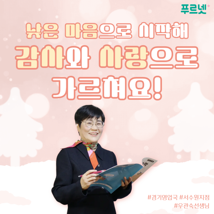 안녕하세요. 푸르넷입니다! 오늘의 푸르넷 선생님을 소개합니다! 아이들을 감사와 사랑의 마음으로 가르치시는 #경기영업국 #서수원지점 우관숙 선생님의 푸르넷 이야기를 소개합니다! <푸르넷>에서 되찾은 가르침의 열정 14년 전 <푸르넷 공부방>을 처음 시작했을 땐 다시 아이들을 가르칠 수 있다는 생각에 가슴이 벅차고 감사한 마음으로 가득했어요. 이전에 15년간 학원을 운영했었는데, 경제적으로 어려운 시기를 마주했고 결국 학원을 정리하게 되었거든요. 그 후 1년간 의욕을 완전히 잃고 한없이 마음이 낮아지는 시간을 보냈어요. 그때 <푸르넷 공부방>은 제가 붙잡을 수 있는 유일한 희망이었죠. 욕심 없이....... <img src="https://blogthumb.pstatic.net/MjAyNjAxMDlfMjk1/MDAxNzY3OTE3MTMxMjM0.UIv9qJFdAKMuMw6ibl5s9BZr2L3foRJeJZSV67XO280g.eoRqswHfWQFf5Jz8P7MIrT_1Lqtg-UyS7HMvQZjlcuUg.PNG/%BA%ED%B7%CE%B1%D7%BF%EB_%BD%E6%B3%D7%C0%CF.png?type=s3" />