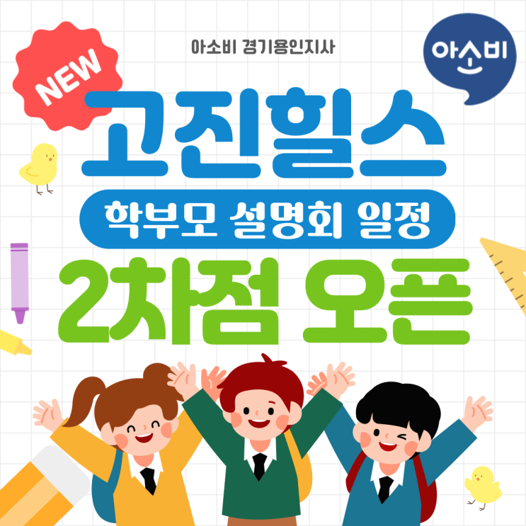 안녕하세요 유치부터 초등 2학년 전문 교육원 아소비 경기용인지사입니다! 기쁜 소식 전해드려요 아소비 고진힐스2차점이 새롭게 문을 열었습니다! 오픈을 기념하여 학부모님들을 모시고 아이 교육에 대한 고민을 함께 나누는 뜻깊은 시간을 마련했어요 우리 아이 공부, 언제 어떻게 시작하는 게 좋을까요? 유아기부터 초등 저학년 시기는 학습의 ‘출발점’을 만드는 아주 중요한 시기입니다. ✔️ 어떤 방식으로 ✔️ 어떤 방향으로 ✔️ 어떤 습관을 잡아주느냐에 따라 아이의 공부 자신감과 태도가 달라질 수 있어요 ✨ 그래서 준비했습니다! 부모님의 궁금증을 시원하게 해결해드릴 아소비 고진힐스2차점 학부모 설명회....... <img src="https://blogthumb.pstatic.net/MjAyNjAyMjBfMTYz/MDAxNzcxNTQzMjg5MzUz.QUIV2HY_PbvFLC46hTXw0G_D5G6ZSs6Twq1PqAhkNmcg.LHHFKrXhxc0HretNG5SSvJATFvGqquaVLA019BmFPQUg.PNG/%C1%A6%B8%F1%C0%BB-%C0%D4%B7%C2%C7%D8%C1%D6%BC%BC%BF%E4_-001_%282%29.png?type=s3" />