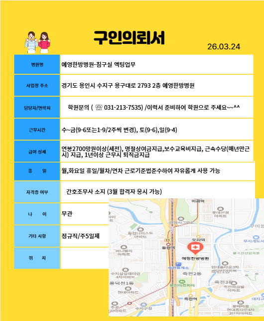 #광교간호학원, #용인간호학원, #수지간호학원, #수원간호학원, #용인간호조무사, #용인수지간호학원, # 용인국비지원, #국비지원간호학원, #내일배움카드, #상현역, #간호조무사, #국비간호학원, #흥덕간호학원, #병원취업, #병원실습 어제, 2026년도 상반기 간호조무사 국가시험 발표일이었어요!! 단톡방의 축하와 응원의 메시지로 가득했답니다^^ 오늘은, 예영한방병원 채용공고 공유하려고 해요~~ 학원 홈페이지 접속하시면 더 많은 채용공고를 보실수 있어요^^ https://www.ggnurse.co.kr/bbs_shop/read.htm?cate_sub_idx=0&search_first_subject=&me_popup=0&auto_frame=&passwd=7535&list_m....... <img src="https://blogthumb.pstatic.net/MjAyNjAzMjZfMjQ4/MDAxNzc0NDk1MzU3MDA4.1MSa8yBkMHvg_JBuYT2nMwHUociN3yetrY_BSCo6-JUg.bjGQphHFYT6d2htHZQJ9Vx4ftGlHAdkW7M0kcnW2cKIg.PNG/%BF%B9%BF%B5%C7%D1%B9%E6%BA%B4%BF%F8.png?type=s3" />
