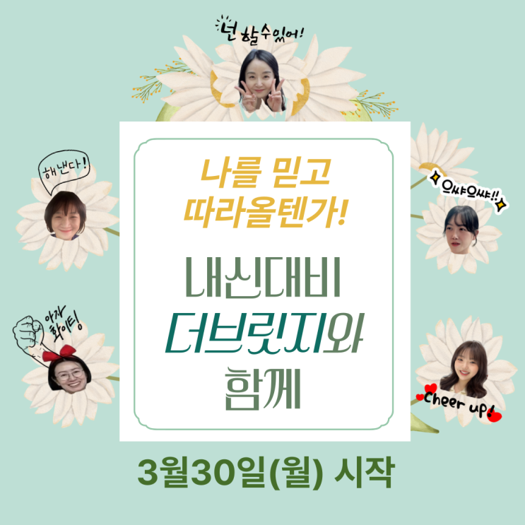 안녕하세요. 더브릿지어학원입니다. 내신 대비 기간을 앞두고, 더브릿지어학원 선생님들은 학생들에게 도움이 될 자료를 준비하며 분주한 시간을 보내고 있습니다. 또한 아이들과 시험을 대하는 마음가짐과 공부에 임하는 태도에 대해서도 계속 이야기 나누고 있어요. 아이들에게 작은 즐거움과 응원을 전해주고 싶어, 선생님들의 얼굴을 넣어 응원 이미지를 만들어 보았습니다. 이 안에 선생님들의 마음을 담았습니다. “넌 할 수 있다.” “해낸다.” “아자 화이팅” “으쌰으쌰” “Cheer up” 아이들이 시험 기간 동안 지치지 않고 끝까지 해낼 수 있도록, 함께 노력하겠습니다^^ 내신대비 시작일: 3월 30일 월요일 더브릿지어학원 031-265-....... <img src="https://blogthumb.pstatic.net/MjAyNjAzMjZfNTYg/MDAxNzc0NTA4MTM5MjQ3.qep6QVcDef1QHlLBLdIPa9KLHxOd5sTzAgYv4C-J3dkg.KVvFaSS_SUqI4IX3HK9cAJZ4zvGWjok1GKuTr1CU5CAg.PNG/%B3%BB%BD%C5%B4%EB%BA%F1-%C0%CE%BD%BA%C5%B8%BF%EB-001_%287%29.png?type=s3" />