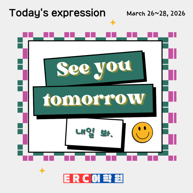 March 26~28, 2026 Today's Expressions 이번 달 주제: 학교 생활 (School Life) See you tomorrow. (내일 봐.) Proverb 이번 달 주제: 학교와 배움 (School & Learning) Wisdom is better than gold. (지혜가 금보다 낫다.) Nothing in the world can take the place of persistence. Keep up studying. ERC어학원 경기도 용인시 수지구 만현로 110 원희캐슬 6층 내 꿈을 찾아가는 즐거운 공부~ 꼼꼼한 관리로 소문난 ERC어학원~ Phonics부터 중등을 넘어 수능까지 쭈~욱! #Today's #Expression #Proverb #상현동영어학원 #상현동어학원 #수지구영어 #상현초 #서원초 # 솔개초 #이현초 #심곡초 #서원중 #소현중 #이현중 #Phonics ....... <img src="https://blogthumb.pstatic.net/MjAyNjAyMjNfMjI2/MDAxNzcxODQ0Mjk3MjE0.O_gn16OJ1k_KE1UOxp9vyI-bAUuBn2JysytnTFCebEYg.NIJh8CmZvFQ0PnRq60Yha76q36cwZw_Qw69H2c0eR5cg.PNG/0_TE_20260326.png?type=s3" />