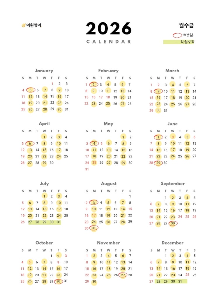 안녕하세요, 이원영어입니다 2026년 연간 학원 일정표를 안내드립니다. 학부모님들께서 여행 일정, 학교 일정, 학습 계획을 세우실 때 참고하실 수 있도록 개강일 / 휴강일 / 학원 방학 일정을 미리 정리해두었습니다. ✔ 노란 표시 : 정상 수업일 ✔ 빨간 표시 : 휴강일 ✔ 빨간 동그라미 표시 : 개강일 ✔ 연두 표시 : 학원 방학 이원영어는 장기적인 학습 흐름이 끊기지 않도록 필수 휴강일을 제외하고 안정적인 수업 운영을 목표로 하고 있습니다. 특히 시험 기간에는 학습 루틴이 흔들리지 않도록 가능한 일정 변동 없이 꾸준히 수업을 진행합니다. 학부모님들께서도 미리 일정 참고하시어 가족 일정 및 학습 계획에 활용 부탁드립니다....... <img src="https://blogthumb.pstatic.net/MjAyNjAzMjdfMzkg/MDAxNzc0NTgwNDE2Mjk5.xtQhRGwEsh5yET6lRn2Oo2mxDd8-hDSPR0VRpU7wZmIg.HsS0AtFAbvTEBIJCB9V70R8aGKI3BVCjp1ajMp5swKUg.JPEG/900%A3%DF1774579429782.jpg?type=s3" />