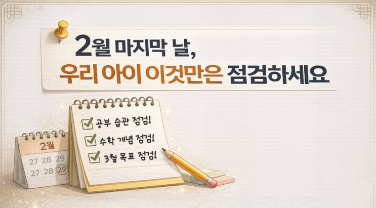 안녕하세요 여러분! 벌써 2월의 마지막 날입니다. 곧 개학이네요! “이번 방학, 잘 보냈을까?” 아마 많은 부모님들 마음속에 같은 질문이 있을 거예요. 하지만! 아직 늦지 않았습니다!! 오늘 하루 점검이 3월을 바꿀 수 있습니다. ① 공부 ‘시간’보다 ‘루틴’이 잡혔나요? 방학 동안 문제를 얼마나 많이 풀었는지도 중요하지만, 더 중요한 건 공부하는 습관이 자리 잡았는지입니다. - 정해진 시간에 앉는 습관 - 숙제를 미루지 않는 태도 - 오답을 다시 보는 습관 3월이 되면 학교 일정이 더해지면서 루틴이 없는 아이는 금방 흔들립니다. 오늘, 아이의 하루 공부 흐름을 한번 체크해 보세요. ② 수학 개념에 빈 구멍은 없나요? 특히 수....... <img src="https://blogthumb.pstatic.net/MjAyNjAyMjdfMTA2/MDAxNzcyMTk5NjIzNDc4.DtMTPQeG8smA06JVl_GGcCsCaIle4WaDL4xa236UUjYg.0zEO0fET8ztCBx24wyyHHb9Mw7I_oNgB6cvI7Y4kZGIg.PNG/900%A3%DFfile%A3%DF000000001f287206a842de489e683ac9.png?type=s3" />