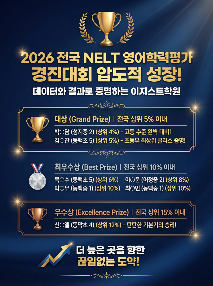 [동백 이지스트학원] 점수보다 빛나는 아이들의 '성장' 이야기 - 26년 전국 NELT 경진대회 결과 최상위 기록