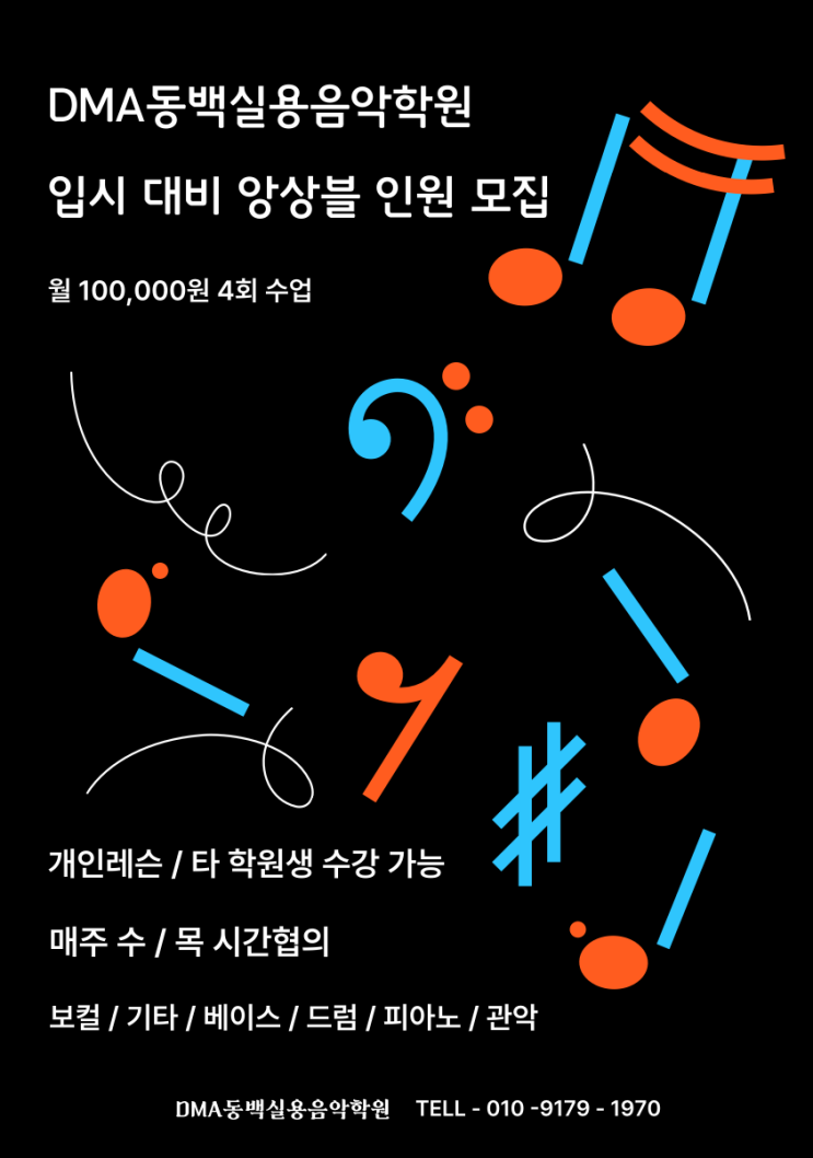 매주 수 / 목 개인레슨 , 타 학원생 수강 가능합니다! 보컬 / 기타 / 베이스 / 드럼 / 괸악 월 100,000원 4회 수업 기준입니다! 상담 / 문의 TELL - 010 - 9179 - 1970 <img src="https://blogthumb.pstatic.net/MjAyNjAzMDdfMTUx/MDAxNzcyODU5MzAyNzE5._dJiog2RiFBBNPQAGtStcTYbTSCWUgk8yx3OabU5AJQg.Cw3BfHbUZzHU4LZ9oOfTQtFU46KThPZYfY3BCGUygJcg.PNG/%BD%BA%C5%A9%B8%B0%BC%A6_2026-03-07_13.54.58.png?type=s3" />