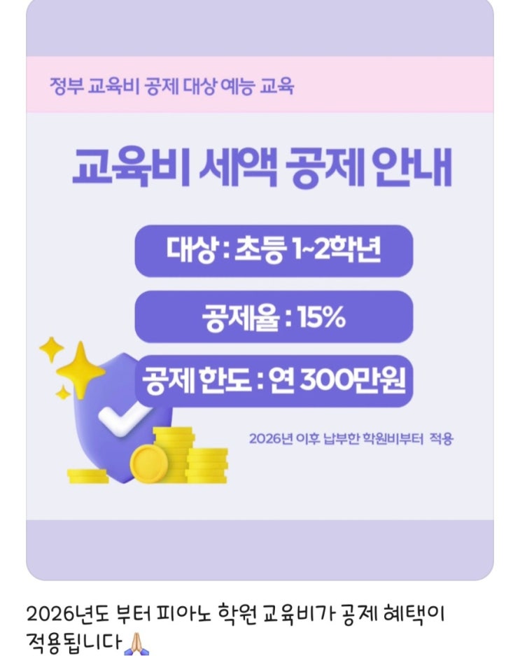 안녕하세요, 바로크 음악 학원입니다. 이번에 초등학교 입학하는 1학년, 2학년 친구들에게 좋은 혜택을 안내드리려 글을 올립니다. 많은 교육 상담 기다리겠습니다. 교육 문의 031-274-8088 010-3943-7805 #피아노 #초등 #바이올린 #플루트 #성인 #초등 예체능 공제 혜택#성인 취미 피아노#중고등 취미 피아노 <img src="https://blogthumb.pstatic.net/MjAyNjAzMTBfODQg/MDAxNzczMTE4MTY2NzUw.0WgXaHJoQD2v0c7Nh6jXTvTBJhPQTAwYJ8hRHjHgc-Ig.-tKX1o6wP0NyhxBj5mNjY1qHm1NaEkRppSKZ6Df90f8g.JPEG/900%A3%DF1773117956925.jpg?type=s3" />