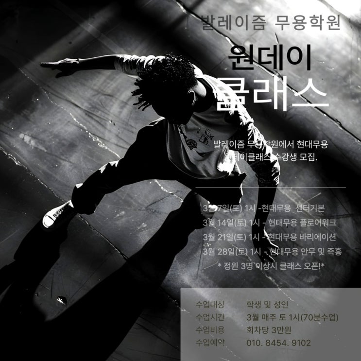 발레이즘 무용학원 현대무용 원데이 클래스 수강생을 모집합니다!! *모집기간 2026년 2월28(토)~ 3월 7일(토) • 발레이즘이 제안하는 단 하루의 밀도 높은 현대무용 클래스. • 3월 원데이 클래스 일정️ ————————————— ▪ 3월 7일(토) 1시 – 현대무용 센터기본 ▪ 3월 14일(토) 1시 – 현대무용 플로어워크 ▪ 3월 21일(토) 1시 – 현대무용 바리에이션 ▪ 3월 28일(토) 1시 – 현대무용 안무 및 즉흥 ————————————— ✔ 각 회차별 선택 수강 가능 ✔ 수업 정원 3명 이상 시 클래스 개설 ✔ 정규클래스 희망시 수업가 할인 • 수업대상 : 학생 및 성인 일반 수업시간 : 매주 토요일 1시 (70분 수....... <img src="https://blogthumb.pstatic.net/MjAyNjAyMjhfMTMg/MDAxNzcyMjg2MTIyODA0.OECYlIEKu_biy5f7IxNN-o74cAnR-KgfB5IJ2GRVUkEg.99mphRKmg2zo0W_QFgTRT8WuQ_hGLKEWOQCsyvmRxIUg.JPEG/IMG%A3%DF0686.JPG?type=s3" />