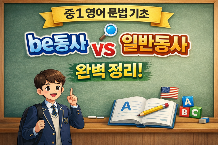안녕하세요. 지엘 영어샘입니다^^ 새학년이 된 지 10일이 되었네요~ 중학교 1학년 때 학교에서 처음 배우는 영어 문법은 바로, be동사와 일반동사인데요, 오늘은 be동사와 일반동사에 대해서 살펴볼게요. 헷갈리는 학생들은 필독! 집중!해주세요^^ be동사와 일반동사 이 두 가지를 정확히 이해하지 못하면 이후에 배우는 현재형, 과거형, 현재진행형, 현재완료까지 계속 헷갈리게 됩니다. 그래서 중1 영어에서 가장 중요한 문법 기초는 바로 “be동사와 일반동사의 차이”를 정확히 구분하는 것입니다. 오늘은 중1 학생들이 꼭 알아야 할 핵심 내용을 정리해 보겠습니다. be동사란 무엇일까? be동사에는 두 가지 뜻을 가진 동사에요. 1) ~이다 2)....... <img src="https://blogthumb.pstatic.net/MjAyNjAzMTNfMTkz/MDAxNzczMzYwNzg3OTYx.w4iR9oOCWRowkmhWlm2s3ulZUEyAHBxXBiDsXneAe7og.rddBMy1JbDWFq5fsmkQOdN_D0fy30VueiBOdXpai6ysg.PNG/ChatGPT_Image_2026%B3%E2_3%BF%F9_12%C0%CF_%BF%C0%C8%C4_10_52_36.png?type=s3" />