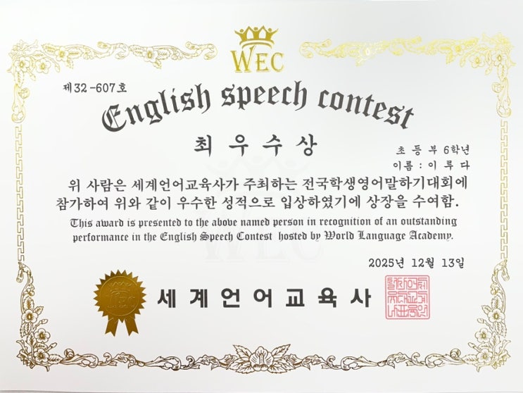 안녕하세요. 에이클래스 영어학원입니다. 오늘은 기쁜 소식을 전해드리고자 합니다 초등 6학년 학생이 꾸준한 노력 끝에 값진 결과를 거두었습니다. 매주 빠짐없이 성실하게 연습해 온 아이였고, 스피치를 무사히 마친 순간 어머님도 저도 감동의 눈물을 흘렸습니다. 무엇보다 값진 것은 결과보다도, 그 과정 속에서 아이의 스피킹 실력이 눈에 띄게 성장했다는 점입니다. 아이 스스로도 자신감을 얻고, 영어로 말하는 것을 즐기게 되었습니다. 이 학생은 누구보다 조용하고, 본인 피셜 Mbti가 “I”였던 친구였습니다~ 중학교 입학을 앞두고 스스로의 가능성에 도전하고, 부족함을 극복해 보고 싶다는 마음으로 자발적으로 저에게 해보고 싶....... <img src="https://blogthumb.pstatic.net/MjAyNjAxMzBfMjAy/MDAxNzY5NzUzODQ4MDAz.Rps1pHo922dtyWvM-I8DGXguqdH2OCEM2Oth9Cb5w30g.gJrvDIQ4_CxUX3mxxk0RS9ETxxHB2-JJ7VSA23p8ObEg.JPEG/IMG%A3%DF6800.JPG?type=s3" />