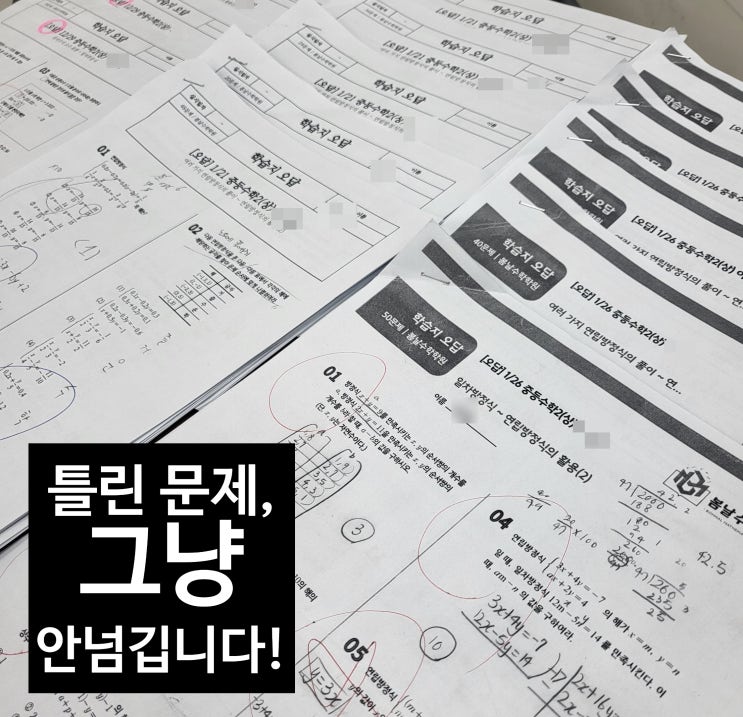 중등 수업에서는 단순히 문제를 많이 푸는 것보다 틀린 문제를 어떻게 다시 보느냐 가 매우 중요합니다. 그래서 학생 한 명 한 명에게 개별 오답노트를 운영하고 있습니다. 솔직히 이 과정은 쉽지 않습니다. 시간도 많이 들고, 수업 준비도 더 세밀해집니다. 하지만 학생의 실수를 정확히 잡아주는 데에는 ✔ 개별 오답 관리만큼 효과적인 방법이 없다고 믿습니다. 틀린 문제를 그냥 넘어가는 대신, 왜 틀렸는지 어디에서 판단이 흔들렸는지 ✏ 풀이 과정을 어떻게 고쳐야 하는지 를 다시 정리하게 합니다. 실제 수업 사례 한 학생은 시험 때마다 “아는 문제인데 실수로 틀렸다”는 상황이 반복됐습니다. 그래서 틀린....... <img src="https://blogthumb.pstatic.net/MjAyNjAyMTNfMjY2/MDAxNzcwOTE2NjAzMzA2.XqSU-K0kTTU23WLDqaKSPLUBPN7uFs50SwIGkCRUyHQg.9R9GVSPVNMYHUdt8MIjtCdu9JUFjc8LjflHbejaex6gg.JPEG/KakaoTalk_20260212_140751955_01.jpg?type=s3" />