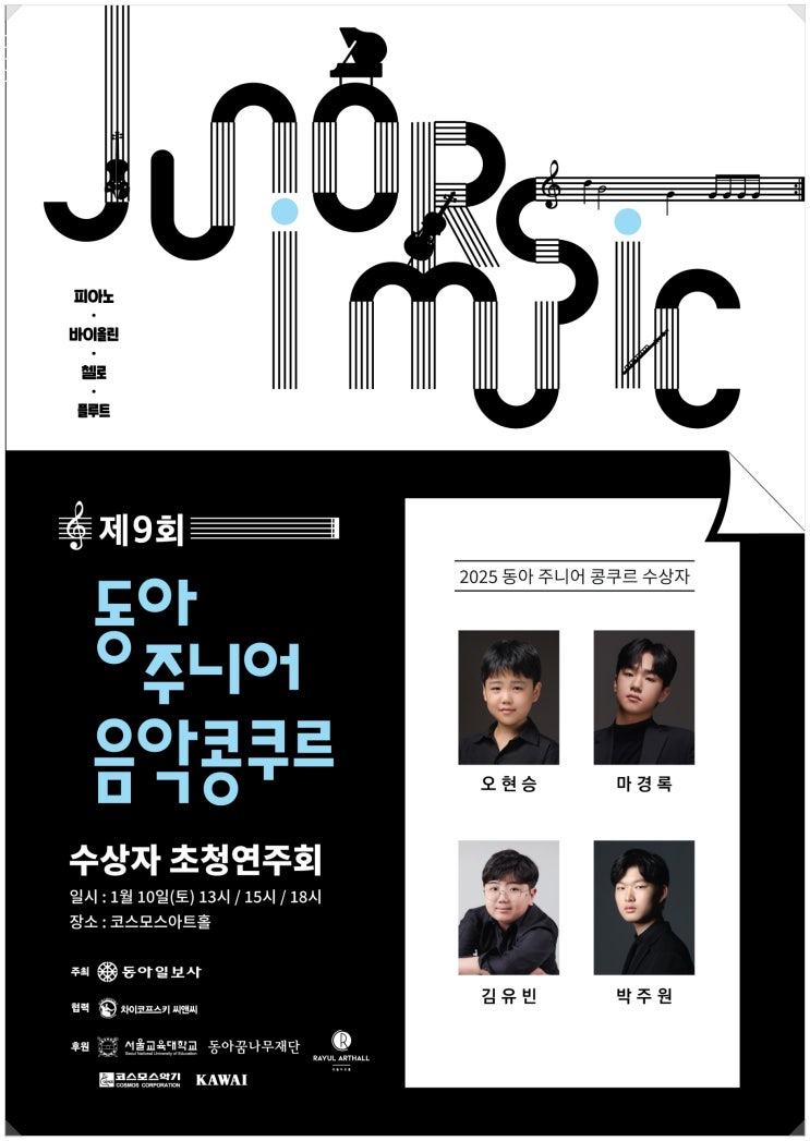 제 9회 동아 주니어 음악콩쿠르 수상자 초청 연주회 마경록 피아노 독주회 일시 : 2025. 1. 10 (토) 오후 3시 장소 : 코스모스아트홀 지난 '제 9회 동아주니어 음악콩쿠르'에서 고등부 1위로 입상한 경록이가 오는 1월 10일 토요일 오후 3시, 코스모스아트홀에서 독주회를 가집니다. 쉽지 않은 프로그램으로 단시간 독주회를 준비하며 끝까지 최선을 다하고 있는 경록이, 연주를 준비하는 이 시간을 통해서도 많이 성장했으리라 생각합니다. 무대에서 더 빛날 경록이를 응원하는 마음으로 기대하며, 많은 관심과 축하부탁드립니다! <img src="https://blogthumb.pstatic.net/MjAyNjAxMDNfMTk5/MDAxNzY3NDQ2NzU1NTc1.kirKqEHdFp7jMmRG7c368RM9E8R_72NdOCUKPczUtRQg.OBveSpGkJD1c3Ihh2fnlUCWWH5SMfIIoMV3Gn3xJLdkg.JPEG/KakaoTalk_20251231_145915896.jpg?type=s3" />