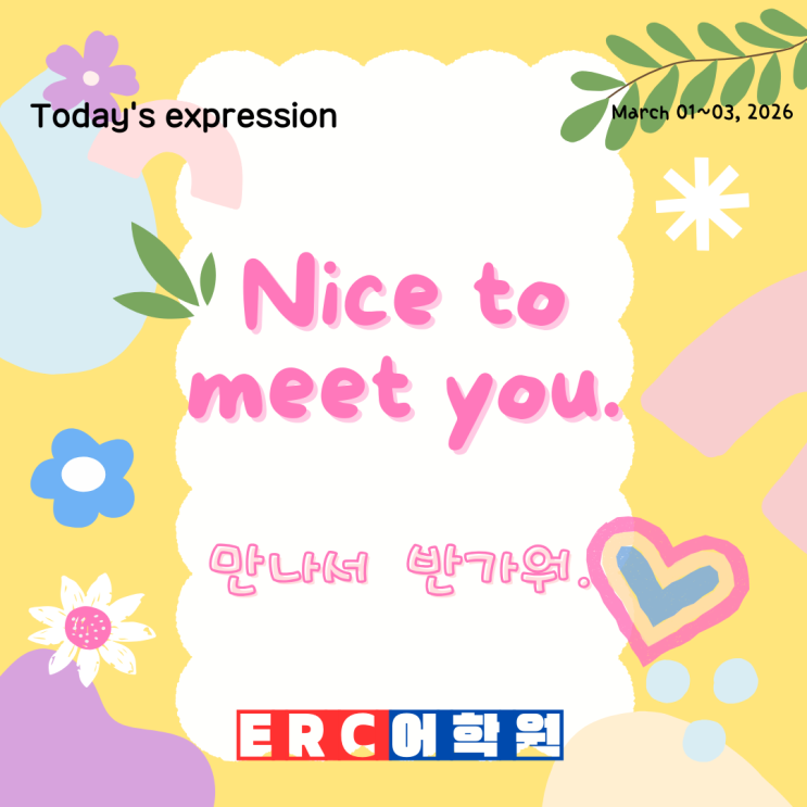 March 01-03, 2026 Today's Expressions 이번 달 주제: 학교 생활 (School Life) Nice to meet you. (만나서 반가워.) Proverb 이번 달 주제: 학교와 배움 (School & Learning) Easier said than done. (말하기는 쉬워도 행동은 어렵다.) Nothing in the world can take the place of persistence. Keep up studying. ERC어학원 경기도 용인시 수지구 만현로 110 원희캐슬 6층 내 꿈을 찾아가는 즐거운 공부~ 꼼꼼한 관리로 소문난 ERC어학원~ Phonics부터 중등을 넘어 수능까지 쭈~욱! #Today's #Expression #Proverb #상현동영어학원 #상현동어학원 #수지구영어 #상현초 #서원초 # 솔개초 #이현초 #심곡초 #서원중 #소현중 #이현....... <img src="https://blogthumb.pstatic.net/MjAyNjAyMjNfMjE2/MDAxNzcxODQzNDEwNjYz.thz28EoJywM-PqYwIhlQK3-3qulqIi2FwPK-1_u-gfQg.MuWwcWqeJtkVuJsKWORBCfCn3bLjyN39jUyxFnUYM5kg.PNG/0_TE_20260301.png?type=s3" />