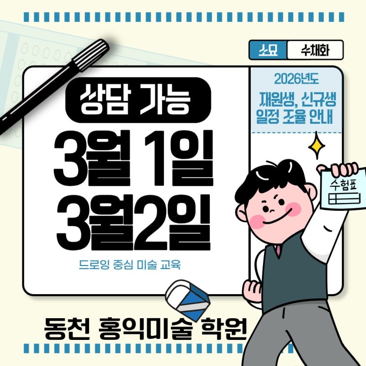 3월 상담 안내 및 전체 클래스 운영 안내 3월을 맞아 주말동안 수업 문의와 상담 요청이 많아지고 있어 상담 가능 일정과 함께 현재 운영 중인 클래스 구조를 안내드립니다.^^ ✔ 3월 상담 가능 일정 3월 1일 (일) 3월 2일 (월) 주말에도 상담을 진행하여 학생의 성향과 목표에 맞는 반 배정을 도와드립니다. 재원생 반이동에 대한 스케줄 알려주시면 바로 답해드리겠습니다. 신규생들은 듣고 싶은 수업클래스 확인 후 등록 안내 개별적으로 드리고 있습니다. ※ 상담을 통해 적합한 클래스로 안내됩니다. 전체 클래스 운영 구조 현재 수업은 연령·목표·진로 방향에 따라 다음과 같이 운영됩니다. 초등부 · 중고등 취미미술 클래스 초....... <img src="https://blogthumb.pstatic.net/MjAyNjAzMDFfMTAz/MDAxNzcyMzI0OTEzNzcw.nU_ju9pr4yO4jSEmjYgYjJZI1ARnbwTMw4qShNsQbK8g.qNlf6ipG7qRFH7pJL74YNh9EVk31D-8NQ1Rw62kk0vAg.JPEG/%C1%A6%B8%F1%C0%BB_%C0%D4%B7%C2%C7%D8%C1%D6%BC%BC%BF%E4._%288%29.jpg?type=s3" />