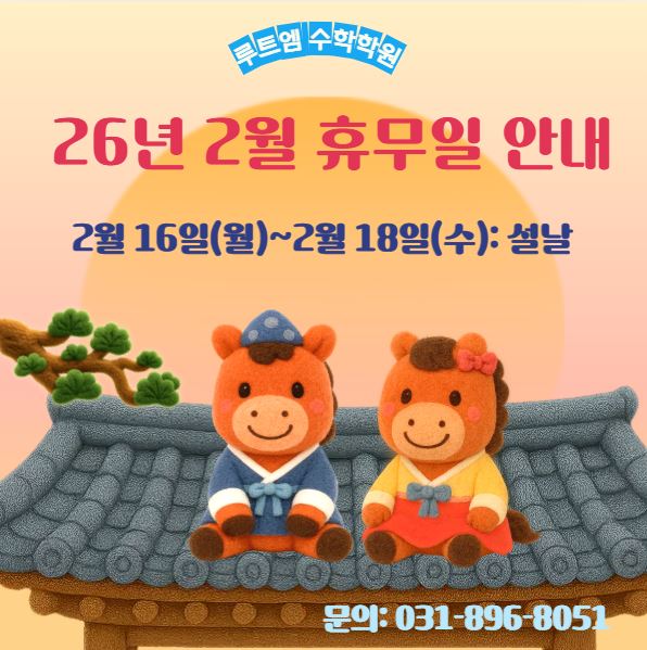 안녕하세요~! 루트엠 수학학원의 2026년 2월 휴무일 안내드립니다. 이번 주 12일부터 겨울방학 진행 중이라 아이들이 열심히 공부하고 있죠? 가정에서도 많은 응원과 격려 부탁드립니다. 2월 16일(월)~2월 18일(수)까지 설날 연휴로 학원도 휴원합니다. 26년 병오년 붉은 말의 해 복 많이 받으시고, 좋은 일만 가득하시길 바라겠습니다. 저희 루트엠 수학 학원을 항상 믿고, 응원해 주시는 부모님들께 항상 감사드립니다. [제 2187-7호] 루트엠 수학학원 [제2911-6호] 루트엠 고등학원 <img src="https://blogthumb.pstatic.net/MjAyNjAxMTdfMTky/MDAxNzY4NjE0NTYzOTMy.ouS3rFdR0kt_B1Ek1xe2qBvR1muMvIZYjD-tpZaOxNIg.DCmK8ZJq3bHwWQXTggiaJ6eYN1XMQjV51ODYLott-bEg.JPEG/26%B3%E22%BF%F9_%C8%DE%B9%AB%C0%CF.JPG?type=s3" />