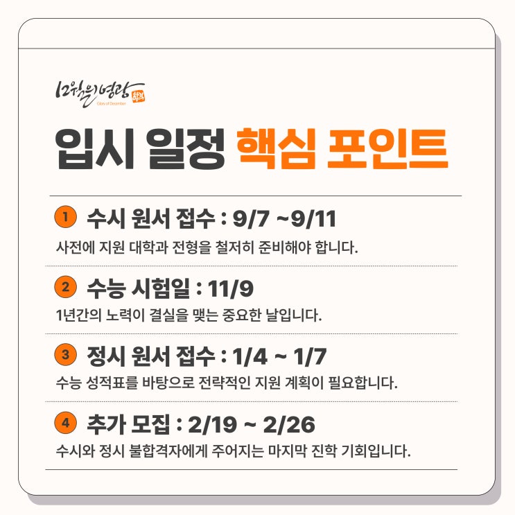 3월부터 시작되는 모의고사 일정 수시 원서 접수 10월 학력 평가 대학 수학 능력 시험 수능 성적 통보 수시 합격 발표 미등록 충원 합격 통보 정시 원서 접수 27학년도 정시 합격 발표 추가 모집 입시 일정 핵심 포인트 12월의영광 성복관 031.262.0950 <img src="https://blogthumb.pstatic.net/MjAyNjAxMjNfMTk4/MDAxNzY5MTUzNjA3MTQ4._3h1OnBinUxkn8K44linQJAV2lrIDoFd56p2nbkh-Owg.U0y5_7fEtBpvGHCnHMC1dY_1mMWd737iCs3jav4TvbUg.JPEG/KakaoTalk_20260122_103605742_09.jpg?type=s3" />