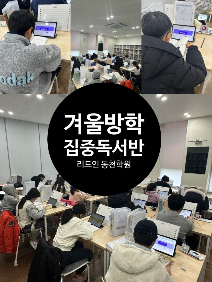안녕하세요. 동천동 독서 학원 리드인 동천학원 원장 은실샘입니다. 이번 겨울은 유난히 추웠지만, 리드인 동천학원 학생들에게는 누구보다 뜨거운 겨울이었습니다. "많이 읽는 방학"이 아니라 "제대로 읽는 방학"이었기 때문입니다. 독서와 글쓰기로 채운 1월과 2월의 이야기를 전해드립니다. 겨울방학 특강 소식 이번 겨울방학에는 오전에 하는 매일 집중 독서반과 한국사 특강이 운영되었습니다. 매일 집중 독서반의 경우 오전 9시 30분 타임과 11시 타임으로 진행되었습니다. 추운 날인데도 불구하고 많은 친구들이 자리에 앉아 리드인 독법에 맞춰 집중 독서를 진행하였습니다. 리드인의 독서는 단순 다독이 아닙니다. ....... <img src="https://blogthumb.pstatic.net/MjAyNjAzMDFfMjUw/MDAxNzcyMzIyNjgxMjYw.TLMKaQlEzBnhODe4HpyctXTwaiVRy3CiPWKGBxEpbtEg._mStW08XacZuGBq6r95WUyPEFNOkCmKAgCMmZ8CzueMg.JPEG/KakaoTalk_20260301_084829394.jpg?type=s3" />