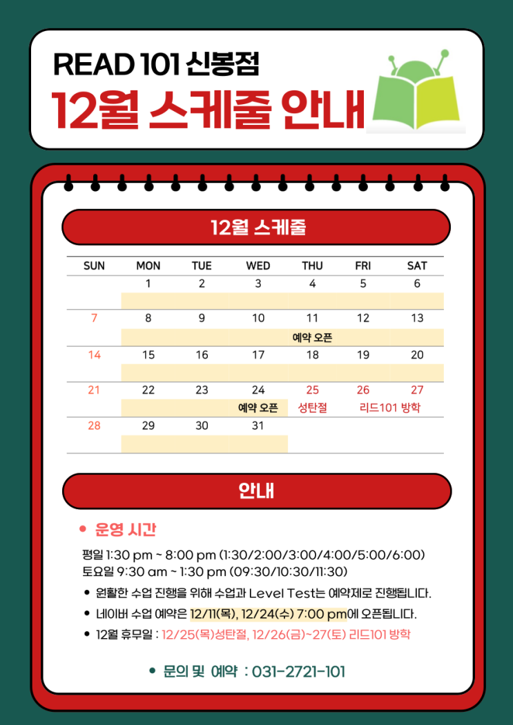 안녕하세요. READ 101 신봉점입니다. 12월 스케줄 안내드립니다. 12월 스케줄 안내드립니다. <12월 휴무 안내> 12/25(목) 성탄절 휴무 12/26(금)~27(토) 리드101 방학 ★ 공휴일 및 학원 방학 기간 동안은 자동 기간연장 됩니다★ · 예약은 2주 단위로 목요일 저녁 7시에 오픈되오나, 12월25일(목) 성탄절 공휴일인 관계로 12/11(목)과 12/24(수) 저녁7시에 2주간의 수업 예약한 번에 하실 수 있습니다. **리드101수지신봉점 12월 학원운영시간 안내** [운영 시간] 학기중 -평일: 오후 1:30 ~ 오후 8:00 (13:30, 14:00, 15:00, 16:00, 17:00, 18:00 6타임) - 토: 오전 9:30 ~ 오후 1:30 (9:30, 10:30, 11:30 3타임) ★ 학원방학 시간표는 1....... <img src="https://blogthumb.pstatic.net/MjAyNTEyMDRfMjE5/MDAxNzY0ODQ2Nzg1MTgx.YL3Eps7R4GfLmSlCY2KaG0W69HShwh5d7qB1iCeoLMsg.gUGYhTBfarPNGakwbk9I2EO87WQDJb21qYwWsZbg4bwg.PNG/12%BF%F9_%BD%BA%C4%C9%C1%D9.png?type=s3" />