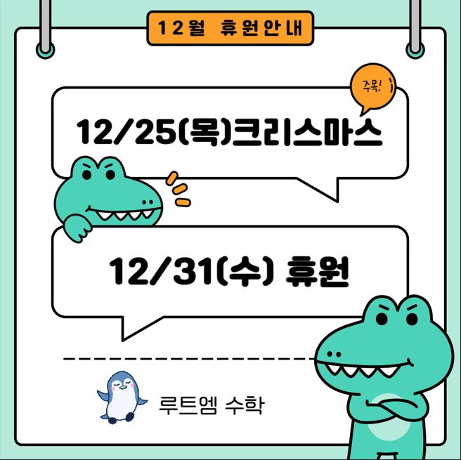 안녕하세요~! 루트엠 수학학원의 12월 휴무일 안내드립니다. ※ 12월25일 (목) 크리스마스, 12월31일(수) 휴원입니다. 2025년 한 해동안 루트엠수학학원에 자녀를 맡겨주신 학부모님께 감사의 말씀을 드립니다 :-) 앞으로도 진심을 담아 아이들과 함께 나아갈 수 있는 루트엠수학학원이 되도록 노력하겠습니다 ~ ! [제 2187-7호] 루트엠 수학학원 [제2911-6호] 루트엠 고등학원 <img src="https://blogthumb.pstatic.net/MjAyNTEyMDZfNiAg/MDAxNzY0OTg4NDYyNTY2.PBD4_2TCvs-ugMtYDGWuDCtzX4NJUA4FDqP3DC2IkP8g.L2mIePywCiBdw6VPpp9vPFlAUJq0BYUHmi5Gx79NO64g.JPEG/12%BF%F9_%C8%DE%C0%CF.JPG?type=s3" />