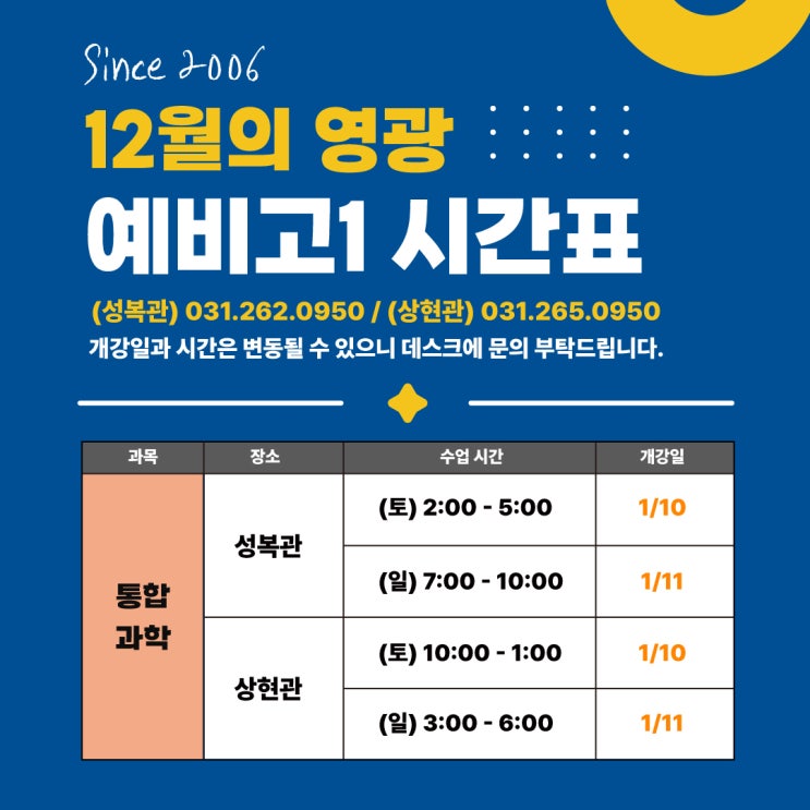 예비고1 통합과학 1월 개강 수업 안내 유햇님T 개강일과 수업시간은 변동될 수 있으니 데스크에 문의 부탁드립니다. 12월의영광 성복관 031. 262. 0950 상현관 031. 265. 0950 <img src="https://blogthumb.pstatic.net/MjAyNTEyMDlfNzMg/MDAxNzY1MjcxMTkwNjEw.wF2pQjAd0_8TSLu_0Ox1wiBCSDsFUiIAlAQadQcJsOog.bl2DXHYmCMyCIOEHO2uXvKDaj9lJZZxBX_JxU8gdL-4g.JPEG/25%B3%E2-12%BF%F9-%BF%B9%BA%F1%B0%ED1-%BD%C3%B0%A3%C7%A5-%C0%CE%BD%BA%C5%B8%BF%EB.jpg?type=s3" />