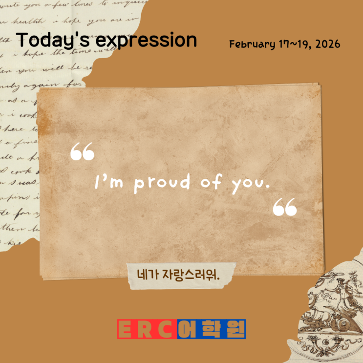 February 17~19, 2026 Today's Expressions 이번 달 주제: 취미와 감정 (Hobbies & Feelings) I’m proud of you. (네가 자랑스러워.) Proverb 이번 달 주제: 친구와 우정 (Friends & Kindness) Friends are treasures. (친구는 보물이다.) Nothing in the world can take the place of persistence. Keep up studying. ERC어학원 경기도 용인시 수지구 만현로 110 원희캐슬 6층 내 꿈을 찾아가는 즐거운 공부~ 꼼꼼한 관리로 소문난 ERC어학원~ Phonics부터 중등을 넘어 수능까지 쭈~욱! #Today's #Expression #Proverb #상현동영어학원 #상현동어학원 #수지구영어 #상현초 #서원초 # 솔개초 #이현초 #심곡초 #서원중 #소현중....... <img src="https://blogthumb.pstatic.net/MjAyNjAxMjhfNDQg/MDAxNzY5NTk3MjIwOTc4.X8s7qVx6Mus0WeYLyGTF5q-aQ5D8RiM21Fco04rWK3Ag.lNJx83xRRn_5-dBvnt5tlyok34wKpzFLMPRETWARQ3Qg.PNG/0_TE_20260217.png?type=s3" />