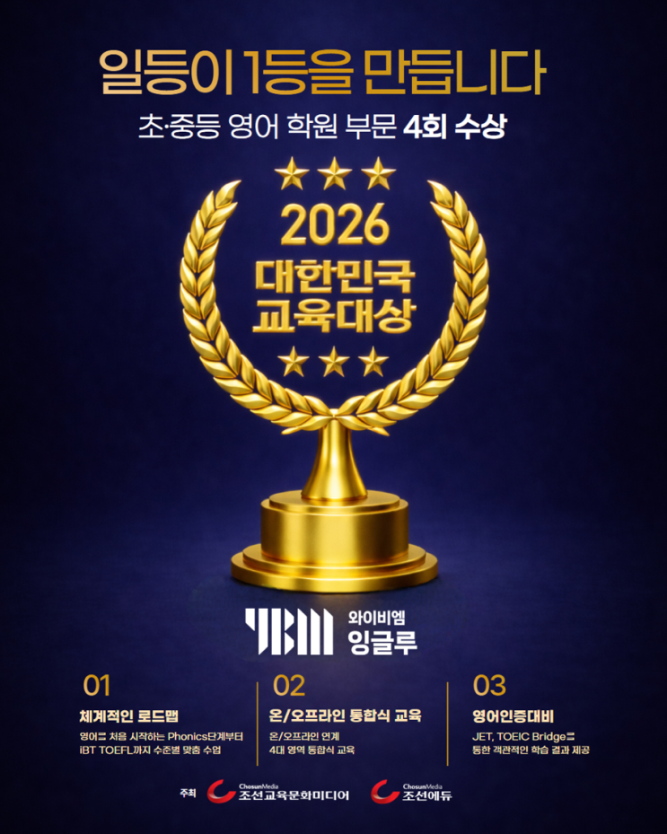 안녕하세요. YBM잉글루 용인상현 제1캠퍼스입니다. YBM잉글루가 조선에듀·조선교육문화미디어가 주관하는 ‘2026 대한민국 교육대상’에서 초·중등 영어학원 부문 대상을 수상하였습니다. 특히 작년에 이어 4회 수상이라는 뜻깊은 성과를 이루게 되었습니다. 학부모님의 많은 성원 감사 드립니다. YBM시사 초중등 영어전문 브랜드인 용인상현 잉글루는 1대1 개별수업, 꼼꼼한 수업관리. 추가 단어 학습 통해 어휘력 증진, 리딩팜/Bookr 전자 도서관 운영, 초등 머핀(Muffin)파닉스 & 파닉스 복습 자료 제공, 다중 Oral테스트를 통해 학습완성도 관리, 중등내신대비 철저(10종이상 시험자료, 문제집 제공), 수지내 중등 내신자료 완비(외부지....... <img src="https://blogthumb.pstatic.net/MjAyNjAzMDZfMTE1/MDAxNzcyNzc0OTYzNDA3.DVr-LiJXOwqEp3xr8-wfUT1NByNAXb4PsE0_78Gnto8g.BUxcTaAAi0p5eZZame5ZLIwbsut6M9WFNaqZ9SoDHhog.PNG/IMG%A3%DF7284.PNG?type=s3" />