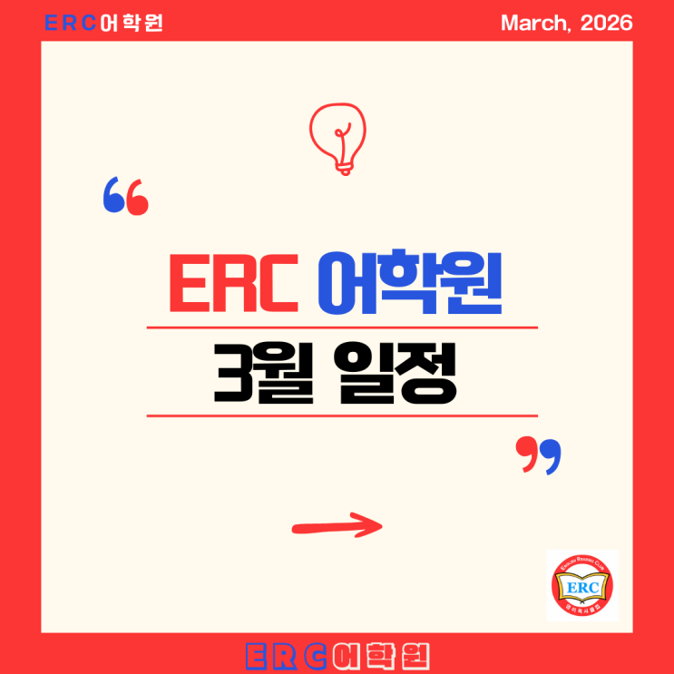 안녕하세요, 내 꿈을 찾아가는 즐거운 영어를 공부하는 ERC 어학원입니다. 따스한 봄바람과 함께 설레는 신학기가 시작되는 3월입니다. 우리 아이들이 새로운 환경에 잘 적응하고, 영어 학습에서도 자신감 있게 첫발을 내디딜 수 있도록 ERC 어학원의 3월 주요 일정을 안내해 드립니다. ️ 3월 주요 학사 일정 새 학기 적응 기간인 만큼, 휴강일과 시험 일정을 꼼꼼히 체크해 주세요! ✨ 3월의 핵심 소식 1. [신규 개강] New Phonics Class (3/11) 상현동 학부모님들이 기다리시던 파닉스 신규반이 드디어 문을 엽니다! 단순히 읽는 법을 넘어, 영어의 소리 원리를 이해하고 스스로 읽는 힘을 길러주는 ERC 어학원만의 커리큘럼으로 영어의 기....... <img src="https://blogthumb.pstatic.net/MjAyNjAzMDlfMTM1/MDAxNzczMDQxNDcwNzY5.AFqSid8RDy-iU_-GFZFIwt_e84SfK2o9xB5QAP1Jl1Yg.VTvrVW2V9psEvcZwVQO78624KzVmyOWYiuMP5z7469kg.PNG/1.png?type=s3" />