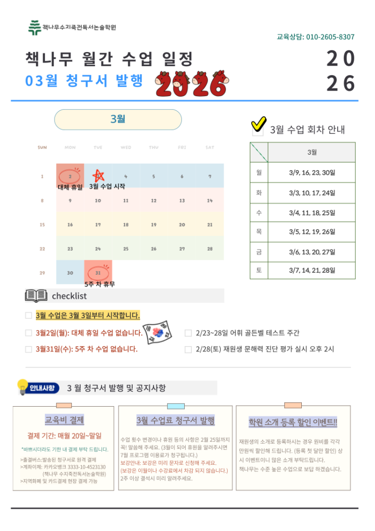 책나무 수지죽전독서논술학원 3월 공지사항 봄의 문턱에서 새 학년을 맞이하는 3월이 찾아왔습니다. 새 교실, 새 친구들과의 만남 속에서 설렘과 함께 작은 긴장도 느끼고 있을 우리 아이들에게 응원의 마음을 전합니다. 지난 시간 동안 책나무에서 함께 읽고 생각하고 쓰며 쌓아온 힘이 여러분의 든든한 밑거름이 되어줄 거예요. 새 학년, 새로운 시작 앞에서 여러분이 가진 가능성을 마음껏 펼쳐 보세요. 책나무는 언제나 여러분의 성장을 응원하며 함께하겠습니다. 3월 수업 일정과 주요 안내사항을 전해드립니다. 1. 3월 수업 일정 수업 기간: 3월 3일(월) ~ 3월 30일(일) / 총 4주 3월부터 수업 시간이 변경됩니다 수업 시작: 오....... <img src="https://blogthumb.pstatic.net/MjAyNjAyMjBfMTIw/MDAxNzcxNTc2NjAwNzA2.JDk0ixVFC3W9b4JyPEzFOl83gc-JC1DfzLvuoAT4478g.jMv9uvAtP1aHIDIn1QS1siivgJC7CX-h6VRy7Dz7Ikcg.PNG/%C1%A6%B8%F1%C0%BB-%C0%D4%B7%C2%C7%D8%C1%D6%BC%BC%BF%E4_-001_%285%29.png?type=s3" />