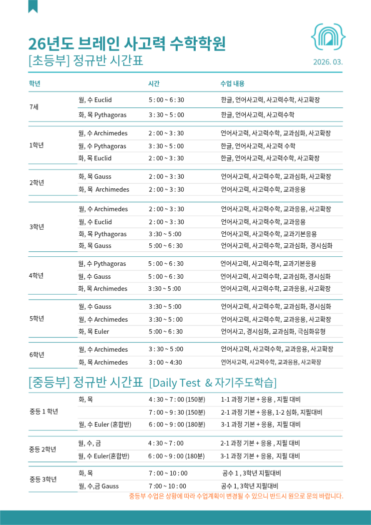 3월 중등 선정도서 + 학습 계획서 ① 중1 _ 과학 ② 중2 _ 시 ③ 중3 _법 & 윤리 ◆중1 ◆국어 수업 1시간 + 논술 수업 2시간 ◆ 논술: 과학 이론 + 생명체가 발생하는 과정 + 과학자의 윤리성 ◆ 국어: 문법 + 문학 + 비문학 중1 커리큘럼은 '미래와 만나는 시간, 과학입니다. 이번 워크북에서는 과학적 탐구 방법을 이해하고 다양한 과학 분야를 살펴보며 그 속에서 과학 기술이 미래 사회에 불러올 변화와 그에 대응하는 인간의 태도에 대해 고민해 볼 것입니다. 중등 연간 커리큘럼 2026년 시간표 <img src="https://blogthumb.pstatic.net/MjAyNjAyMTJfMjcx/MDAxNzcwODk0NzU1OTgx.BvRl3aJeTIYIexVxo_boHdgbYxFl7SZC3AT9YgaRwswg.P1se_rjFbMaDWCpIiAIYYbtOoOC_ZQ31w0ZAlI_BJGYg.JPEG/%B3%EB%B6%F5%BB%F6_%B3%A5%B2%FB%C7%D1_%C4%AB%B5%E5%B4%BA%BD%BA_%C1%A6%C0%DB_%B5%F0%C0%DA%C0%CE_%C0%CE%BD%BA%C5%B8%B1%D7%B7%A5_%B0%D4%BD%C3%B9%B0_%283%29.jpg?type=s3" />