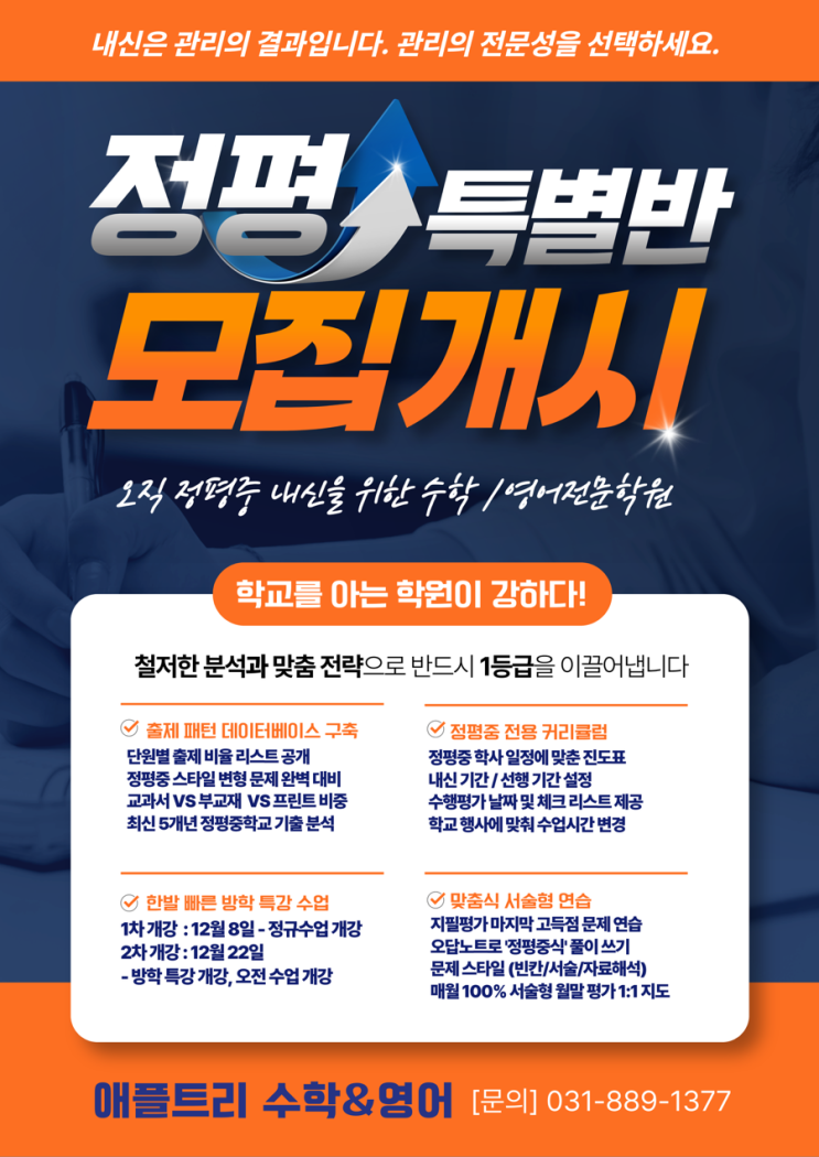 정평중 내신을 준비한다면, 전략은 다릅니다 안녕하세요, 애플트리 수학&영어입니다. 중학생 내신은 한 문제의 무게가 매우 큽니다. 특히 정평중처럼 교과서, 부교재, 학교 프린트의 반영 비율이 다양하고, 해마다 출제 경향이 변화하는 학교의 경우 체계적인 준비 없이는 원하는 성적을 얻기 어렵습니다. 그래서 애플트리는 정평중 학생들을 위한 ‘정평 특별반’을 개설했습니다. 단순한 내신 수업이 아닙니다. 학교를 가장 잘 아는 학원이기에 가능한 맞춤 전략 수업입니다. < 정평중에 맞춘 데이터 기반 학습> 학교 선생님이 어떤 스타일로 문제를 내는지, 교과서 구석 어디에서 변별력 문제를 가져오는지 '알고 덤비는 것&#x....... <img src="https://blogthumb.pstatic.net/MjAyNTExMjZfMjIz/MDAxNzY0MTU4MTY4OTM0.6QDqLWSVXxu430a02oFurdGnkkpFs_QaAdjN3EpZc5Qg.PURg3Jsd1EhRDbQa_iG4z9nwyfASAim837UGCtBfWlYg.PNG/IMG%A3%DF6235.PNG?type=s3" />