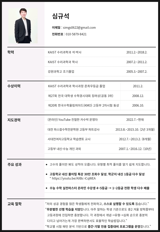 다시한번 최고의 선생님을 모시게되었습니다. 학벌과 가르치는건 또 다르지만, 이분은 찐 입니다. 정말 수학을 좋아하고 아이들 좋아하고 수학교육에 진정성을 가진분입니다. 광교 수지 지역에서 일타가 되실 수학당 수학학원 "친절한 카수박 - 심규석" 선생님을 소개합니다. (예비 중1~ 고등까지 판서반 및 개별 지도반을 맡게 되십니다.) 0명부터 시작하여 지금까지가 도약의 시즌1이었다면 이제부터는 수학당수학학원의 본격성장의 시즌2가 되겠네요. 26년도에도 아이들의 성장이 더욱 크게 기대가 됩니다. (강의 맛보기 : 아래의 유튜브 "좋댓구알" 필수!!) <프로필> 교육 상담 문의 : 01058798421(중고등), 01056....... <img src="https://blogthumb.pstatic.net/MjAyNTExMjdfMjQw/MDAxNzY0MjI1MjYwMTM0.ZiOgMndsGS8t74Q14pecxwQU52s-qlhj_rJFfDrP80cg.uBJsuAbXr9sY01bd-L2WH5Qtt3EJiR_g6cFu9xjzqLYg.PNG/image.png?type=s3" />