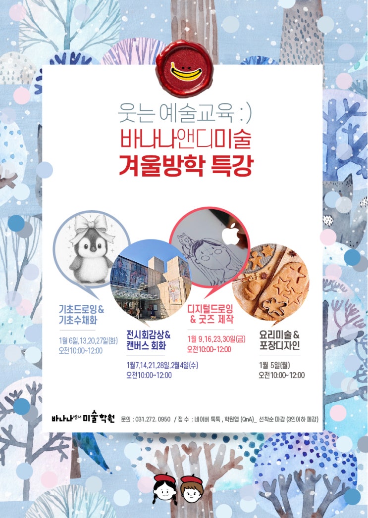 안녕하세요 ~ 수지동천동 미술학원 웃는 예술교육:) 바나앤디미술학원 원장 앤디쌤입니다. 곧 아이들이 가장 기다리는 겨울방학이 다가오고 있어요! 방학은 그저 쉬는 시간이 아니라, 평소 학기 중에는 경험하기 어려웠던 새로운 것들을 시도하고 스스로 성장할 수 있는 소중한 기회인데요. 이번 겨울, 수지 동천동 미술학원 - 바나나앤디미술에서는 우리 아이들이 조금 더 깊이 보고, 더 자유롭게 표현하며, 창작의 재미를 온몸으로 느낄 수 있도록 4가지 알찬 겨울방학 특강 프로그램을 준비했답니다! 이번 겨울방학 특강은 4가지 테마로 구성되어 우리 아이에게 맞는 프로그램을 선택할 수 있어요. 01_작품을 보고 느낀 감동 그대로 캔버스에....... <img src="https://blogthumb.pstatic.net/MjAyNTEyMDlfNDAg/MDAxNzY1Mjg3Njg3ODI4.vFeL7Wv80lLnZfWGEs-eO9Y834oyjgZnqKNwZghp7GMg.V_86qOxAR6mmp4Wy6k-ekYW9aKyYQ3Qxbcd4xUgsKUMg.JPEG/%B9%E6%C7%D0%C6%AF%B0%AD_2025_%B0%DC%BF%EF2-01.jpg?type=s3" />