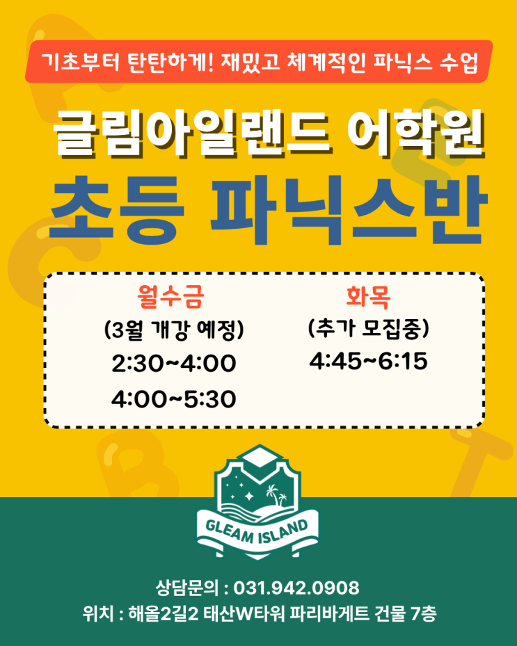 [다율동 글림아일랜드 어학원] 3월 신학기 초등 파닉스반 + 중등부
