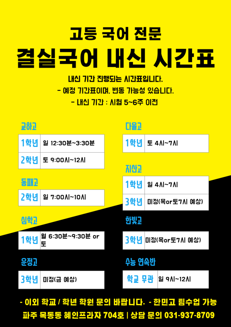 교하고 내신 시간표 1학년 : 일 12:30분~3:30분 2학년 : 토 9:00시~12시 다율고 내신 시간표 1학년 : 토4시~7시 동패고 내신 시간표 2학년 : 일 7시~10시 지산고 내신 시간표 1학년 : 일 4시~7시 3학년 : 미정 심학고 내신 시간표 1학년 : 월 6:30~9시 or 토 한빛고 내신 시간표 3학년 : 미정 운정고 내신 시간표 3학년 수능 연속반 내신 시간표 일 9~12시 #운정고, #한빛고, #지산고, #동패고, #운정국어전문, #운정국어수능, #운정국어내신, #파주국어, #운정고등국어, #운정고국어, #동패고국어, #지산고국어, #심학고국어, #한빛고국어, #산내마을국어, #운정수능, #운정국어, #국어내신, #목동동국어, #고등국어전문, #수능국어전문, #심학....... <img src="https://blogthumb.pstatic.net/MjAyNjAyMTFfMTE1/MDAxNzcwODA1ODM4NTYy.x0AJ5n_BO7r7Tz7bomUzejhVTwZr7HnNr_wnmmb54Ogg.cQbJ_CZBo-am5C2YLV_B0ZkYFXkn9k3rmgVvUqbir20g.PNG/2.png?type=s3" />