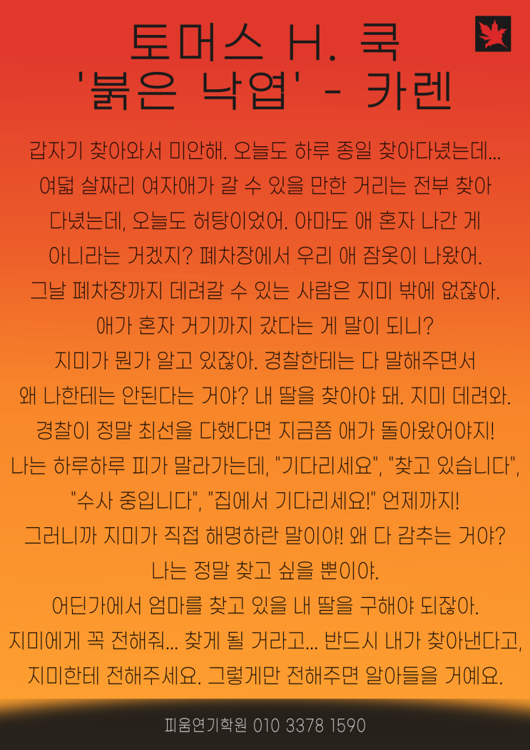 [파주연기학원] 토머스쿡 작, 김도영 각색 / 연극 '붉은낙엽' - 카렌