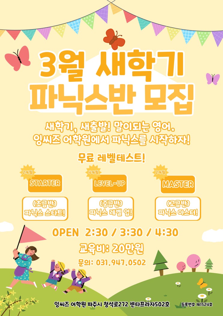 안녕하세요~ 교하의 No.1 잉씨즈 어학원입니다^^ 26년도 시작된지 엊그제같은데 벌써 3월 개강반 소식을 전하다니.. 새해 다짐한것들 잘 지키고 계신가요? 이제 곧 3월이니 올해의 마지막 끼지 최선을 다해보자구요!!! 2026년 3월을 맞이하여 잉씨즈어학원에서 ABC부터 처음 시작하는 친구들(Starter 반), 단모음까지 익숙한 친구들(Level up반), 파닉스를 배웠지만 리딩이 서툰 친구들까지 모집하는 Phonics반 소식을 전해드려요~ 많은 문의 전화를 받고 있는데요. 드디어 모집 안내를 해드려 너무 기쁩니다~ 각 반별 6명씩 선착순 모집이다보니 많은 부모님들이 신청을 못하시고 안타까워 하시는데요 더 많은 학생들을 모집하고싶지만 소수 정....... <img src="https://blogthumb.pstatic.net/MjAyNjAyMjBfMjk1/MDAxNzcxNTYzNzYzNjg2.16lNVM0H2zd0qURpByxq5Xu1gYMjDqv2oNyYfP1K5l8g.Kdt0vkr_k163hIQjjkdg86vB9K_piDsGmXpAPixfnM4g.JPEG/26.3%BF%F9.jpg?type=s3" />