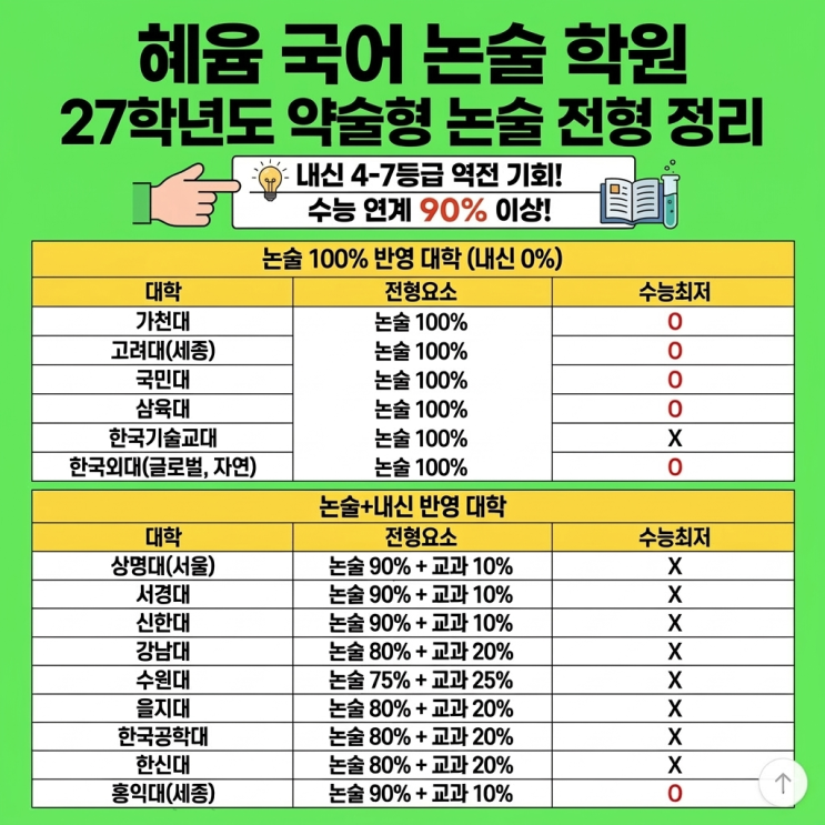 [2027 대입] 내신 4~7등급의 반전 기회! '약술형 논술' 완벽 정리 안녕하세요! 헤윰 국어 논술 학원입니다. 새 학기가 시작되면서 우리 아이 대입 전략 고민 많으시죠? 특히 "내신 등급이 조금 아쉬운데, 수도권 대학은 가고 싶다" 하는 학생과 학부모님들이라면 오늘 이 글에 꼭 주목해 주세요. 내신 4등급, 5등급, 심지어 그 이하라도 역전이 가능한 **'약술형 논술'**에 대해 알기 쉽게 풀어드립니다! 1. 약술형 논술이란 무엇인가요? 어려운 인문 논술이나 수리 논술처럼 길게 글을 쓰는 시험이 아닙니다. * 형태: 주관식 단답형, 혹은 2~3줄의 짧은 서술형 문제 * 난이도: 수능보다는 쉽고, 학교 시험(중간·기....... <img src="https://blogthumb.pstatic.net/MjAyNjAzMTNfMTYw/MDAxNzczMzM1MzA1Nzk4.Kp3jPEIZMv5_kmRvLQIWSQvyzMGnTHgHEEg4hnHKw5Qg.bxNcqXAe4PcCgB7wCYMdrfazX4Xp8txYlTyf-HgisCcg.PNG/1773334949190.png?type=s3" />