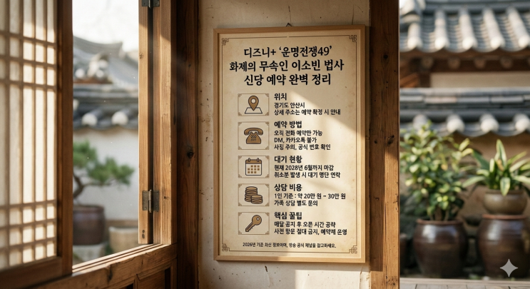 디즈니+ '운명전쟁49' 화제의 주인공, 이소빈 신당 예약 방법과 2028년까지 밀린 대기 현황을 정리했습니다. 경기도 안산 위치, 상담 가격, 전화 예약 성공 꿀팁까지 2026년 최신 정보를 확인하고 빠르게 상담 기회를 잡으세요. 디즈니+ 운명전쟁49 출연, 이소빈 신당 예약 및 대기 현황 디즈니+ 예능 '운명전쟁49' 방영 이후 출연 무속인 이소빈 법사에 대한 관심이 폭발적입니다. 현재 이소빈 신당 예약은 2028년 6월까지 대기가 차 있을 정도로 경쟁이 치열하며, 방송 직후 검색량이 급증하면서 예약 방식과 위치에 대한 문의가 쇄도하고 있습니다. 2026년 기준, 헛걸음하지 않기 위해 반드시 알아야 할 예약 팩트를 정리....... <img src="https://blogthumb.pstatic.net/MjAyNjAyMjdfMTE4/MDAxNzcyMTc2MzMyNTA3.XZ5zEuA3nYcx-X1sHqFQfIGr6EKBZpv0Uij3JgyionAg.E2ZtE-z7JdwEjMUsKgEGbTylHTLuEw_gYDlD2lVLNzcg.PNG/%B5%F0%C1%EE%B4%CF%2B_%BF%EE%B8%ED%C0%FC%C0%EF49_%C3%E2%BF%AC%2C_%C0%CC%BC%D2%BA%F3_%BD%C5%B4%E7_%BF%B9%BE%E0_%B9%D7_%B4%EB%B1%E2_%C7%F6%C8%B2Gemini_Generated_Image_vk3wsbvk3wsbvk3w.png?type=s3" />
