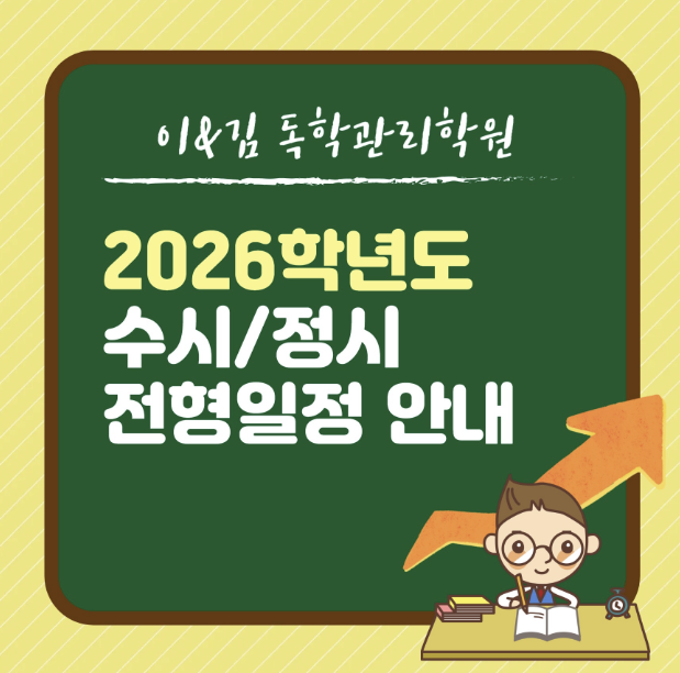 2026학년도 전형 일정 안녕하세요, 이천독학재수학원 이&김학원입니다. 2026학년도(2025년) 수시/정시 일정에 대한 안내드립니다. ◆ 수시모집 ◆ 정시모집 ● 원서접수 ● 전형기간 ● 합격 및 등록 ● 정시 미등록 충원 ◆ 추가모집 이앤김 수능성적표/짐정리 공지 수능성적표 통지일 : 12/5(금) >> 이쌤에게 성적표 캡쳐본 보내기 짐정리 및 1:1 정시상담 예약 : 12/6(토) >> 오후 1시~밤10시 12/6(토)에 사전 약속된 시간에 학원에 와서 짐정리 및 수능성적표 프린트 후 제출, 1:1정시상담 예약을 진행합니다. 1:1정시상담은 12/22~12/30까지 진행됩니다. <img src="https://blogthumb.pstatic.net/MjAyNTExMjZfMjg5/MDAxNzY0MTIwNDM1MDc2.o2i_OfLr_39huwzo6A4itNWWmpoZVv4PoVxdDHXUC-cg.vNnkwMUCexUHWSRpdt7MuXbaH71pY9Bqh0EzXBlafZAg.PNG/image.png?type=s3" />