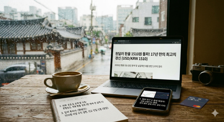 원달러 환율 1510원 돌파에 따른 17년 만의 최고치 경신! 2026년 환율 상승 원인 분석과 함께 달러 투자 시점, 해외 직구 및 유학생 송금 전략 등 실질적인 대응 방안 3가지를 정리해 드립니다. 1510원 돌파한 원달러 환율, 17년 만의 최고치 기록과 향후 전망 2026년 현재 원달러 환율이 1510원을 돌파하며 금융위기 이후 17년 만에 최고치를 기록했습니다. 고환율 상황이 지속되면서 수입 물가 상승과 금리 변동에 대한 불안감이 커지고 있습니다. 지금 이 시점에서 환전이 필요한 분들이나 달러 투자자, 해외 결제가 잦은 소비자들이 반드시 체크해야 할 시장 상황과 대응 전략을 핵심 위주로 짚어드립니다. 환율 1510원 돌파의 주요 원인과 시....... <img src="https://blogthumb.pstatic.net/MjAyNjAzMjNfMjk0/MDAxNzc0MjM0NDEzNzIw.r0BHs4uw2l9TYVfFxUxxuTuHvZ0VuI-r2af0JIEBxp8g.H-bjuXOG-4_ALOOQJu_bVPydPQ1PHNRnqaYu-1WCAbIg.PNG/Gemini_1510%BF%F8_%B5%B9%C6%C4%C7%D1_%BF%F8%B4%DE%B7%AF_%C8%AF%C0%B2%2C_17%B3%E2_%B8%B8%C0%C7_%C3%D6%B0%ED%C4%A1_%B1%E2%B7%CF%B0%FA_%C7%E2%C8%C4_%C0%FC%B8%C1Generated_Image_x7kr3px7kr3px7k.png?type=s3" />