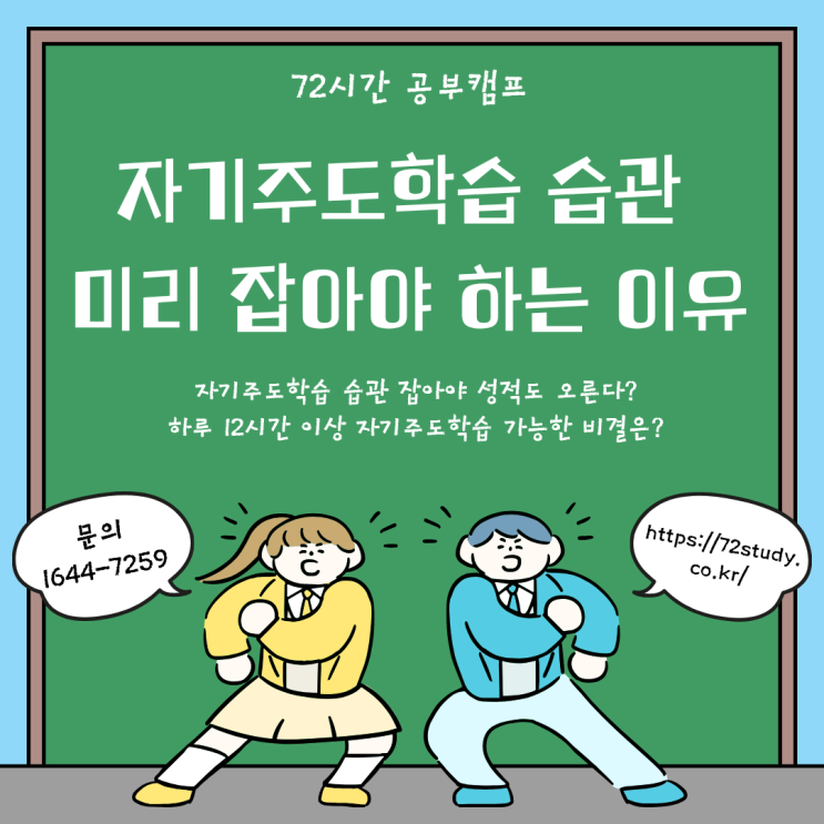 안녕하십니까 2월 마지막 금요일에 인사드리는 72시간 공부캠프입니다. 오늘은 자기주도학습 습관을 미리 잡아야 하는 이유에 대해 설명드리고자 합니다. 자기주도학습은 말 그대로 학생 본인이 주도해서 학습 전과정에 참여하는 것을 말합니다. 공부 잘하는 학생과 그렇지 않은 학생의 차이점은 '자기주도학습 습관'에서 나옵니다. 학습은 '내가 무엇을 잘하는가' 그리고 '어떤 부분을 보완해야 하는가'를 파악하는 것에서부터 시작합니다. 따라서 자기주도학습을 위해서는 내 현 위치를 면밀히 확인하고 이를 보완할 수 있는 계획을 세워야 합니다. 다시 말해, 공부를 잘하려면 내 특성을 점검하고 이에 맞춘 계....... <img src="https://blogthumb.pstatic.net/MjAyNjAyMjZfMTUx/MDAxNzcyMDc4MjM0MzI2.B2z2mMDyyC34XRybkFPQmr6vUfY2UkO9AkuykQSVUuEg.bbEJCdnzzZqDmpDPGlH9LxAomo81bZ03uhTHHiBtr9gg.PNG/%C1%A6%B8%F1%C0%BB_%C0%D4%B7%C2%C7%D8%C1%D6%BC%BC%BF%E4..png?type=s3" />